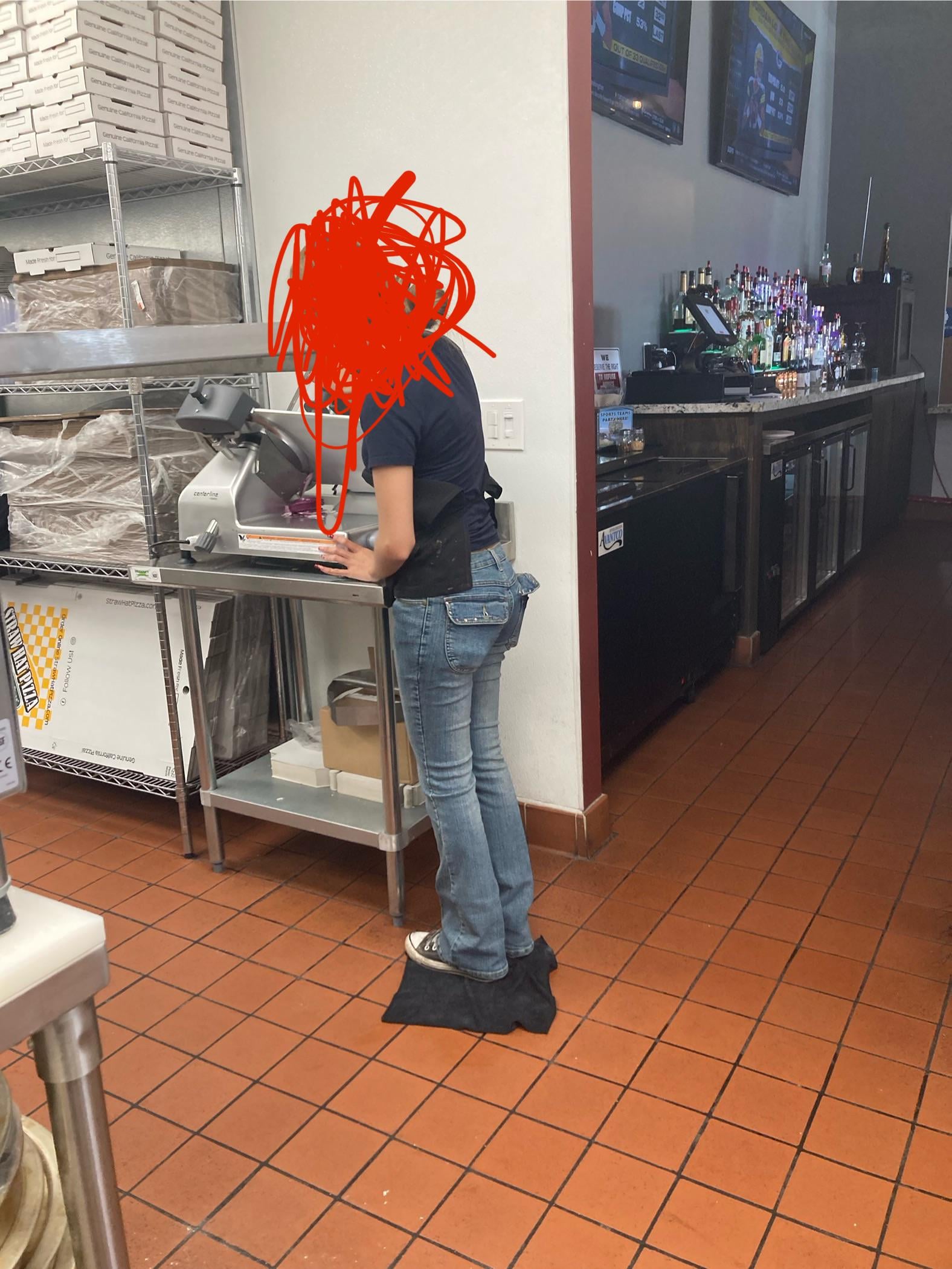 Getting someone without nonslips to step on a wet towel while operating a slicer is the second most concerning thing in this picture.