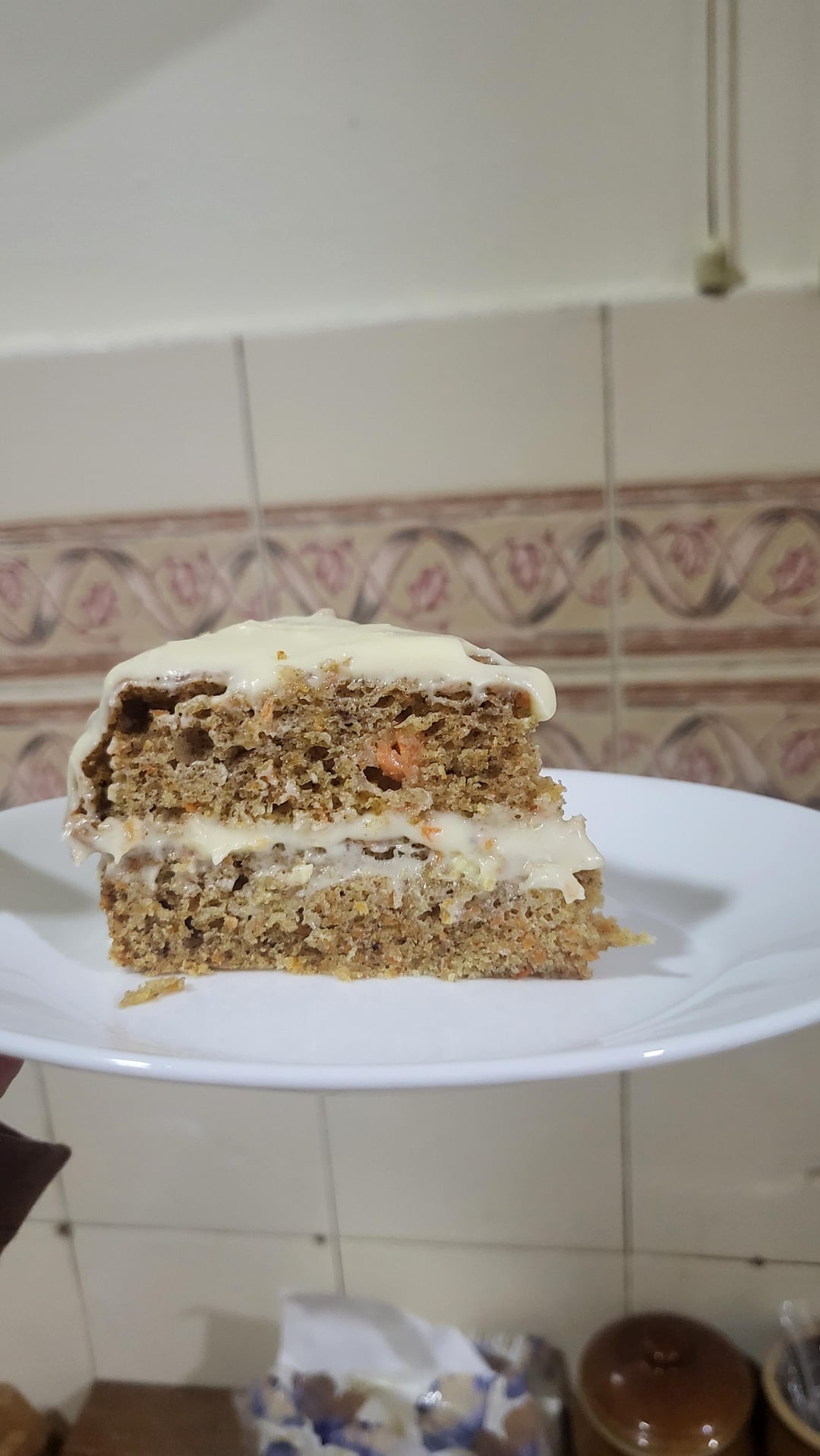 I omit the nuts bcs my mom's allergic, and i used my own frosting. But other than that, i followed the recipe. After almost 6 hours, the cake was ready (altho i didn't pop it in the fridge after frosting lol).