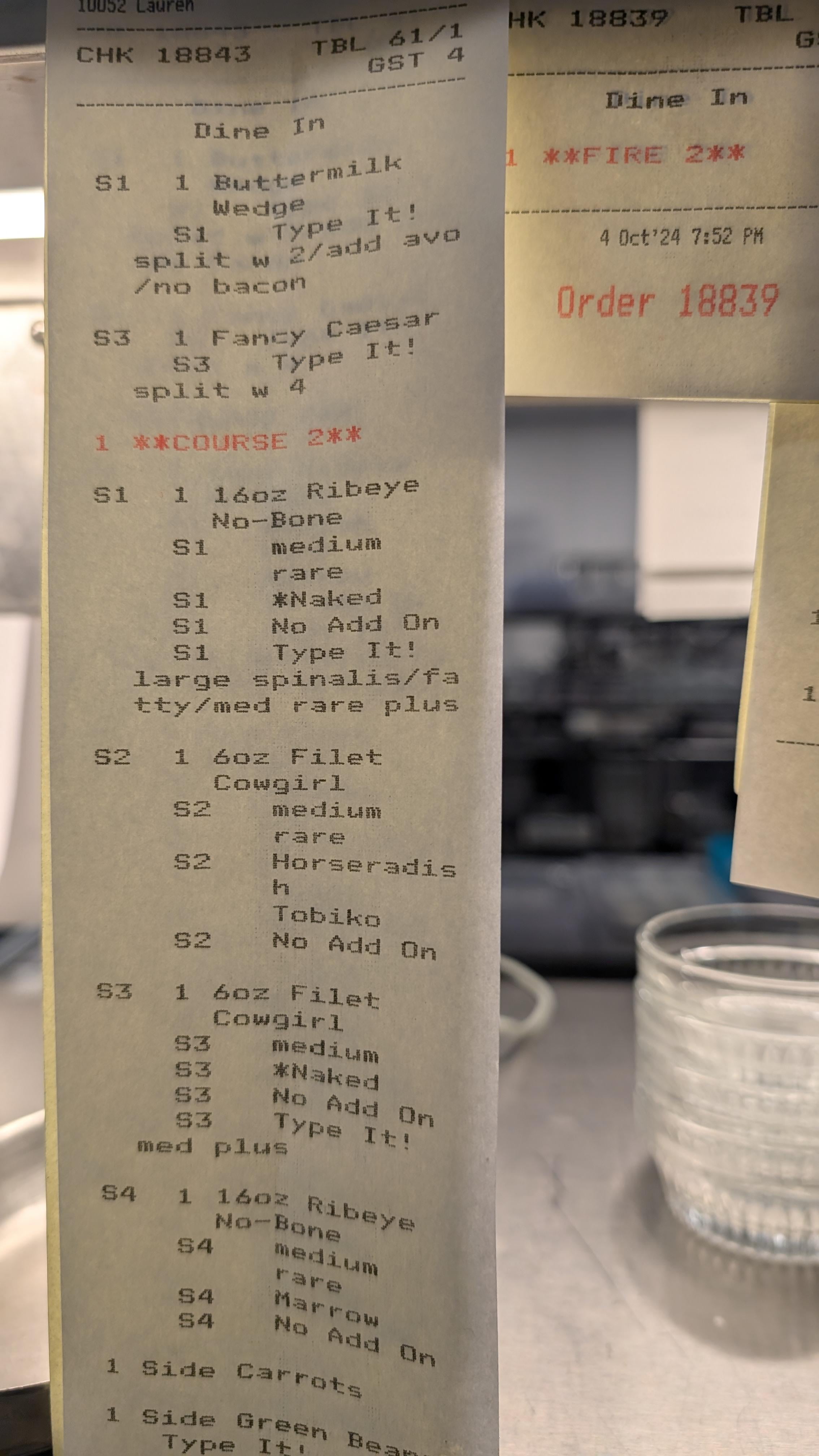 This ticket comes in and Im working grill, I’m pulling the sickest high loin cut, all spinalus, and grilling that hot and fast then resting it for 10 mins next to the grill with a 1/4lb of butter on top. This guy likes steaks like I do. And he is not wrong.