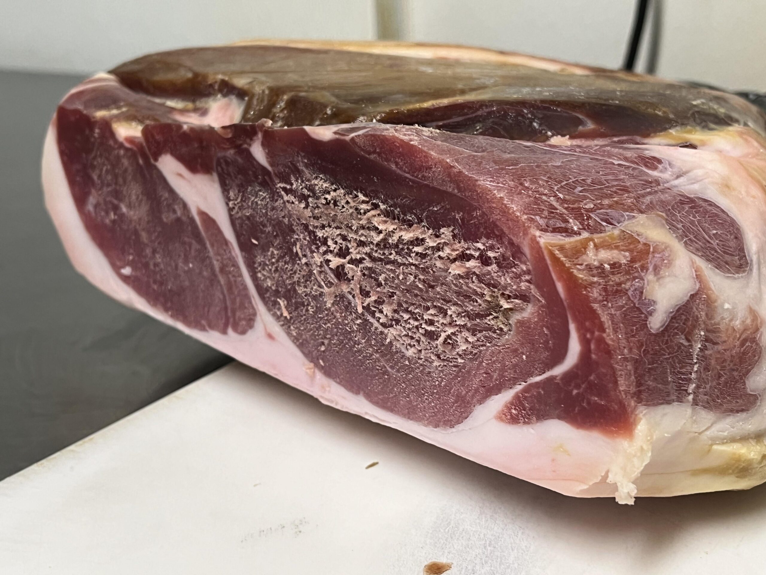 If you did this (made the hole in this prosciutto) on a slicer my bet is too much/uneven pressure was applied to the meat as it was sliced.