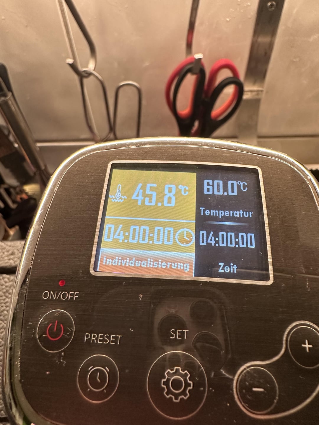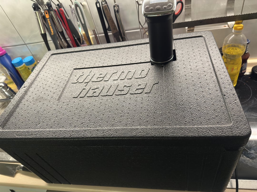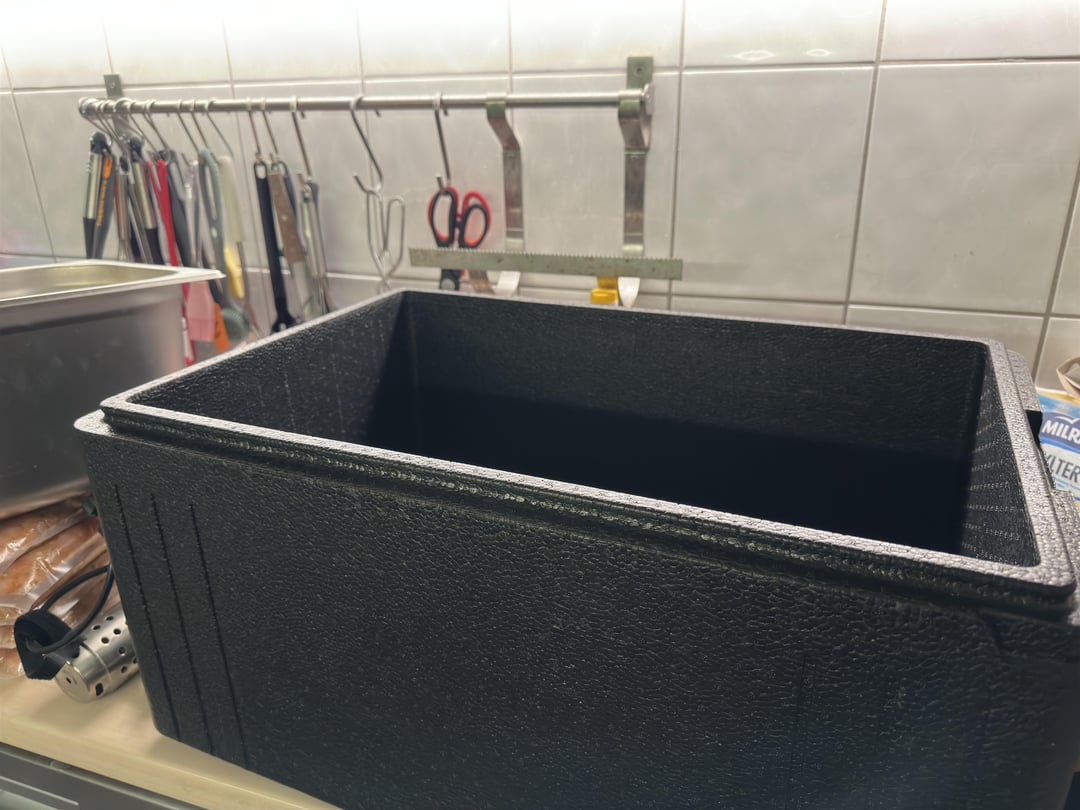 For that I got myself a thermobox to safe on electricity. In that box get a big bowl that is used in restaurants. I put a small plate onto the packs so they will stay under the water and onto that comes a small lid. The box gets closed and now needs less electricity to heat the water.