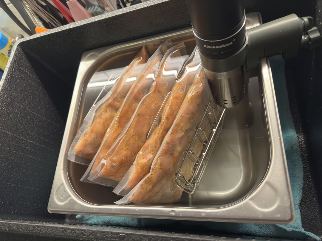 I like the setup, and maybe I’m paranoid, but it doesn’t look like your bags are fully submerged in photo #3. I realize with all of the covers the heat probably gets there but I’d be worried about evap over the cook.