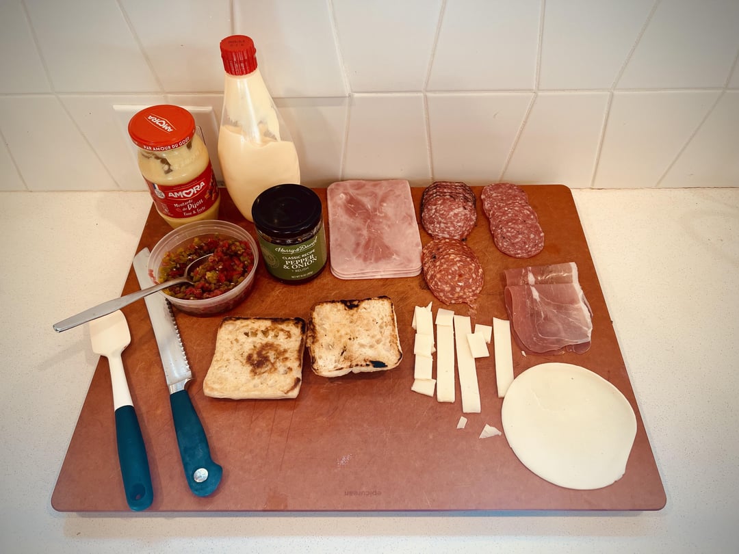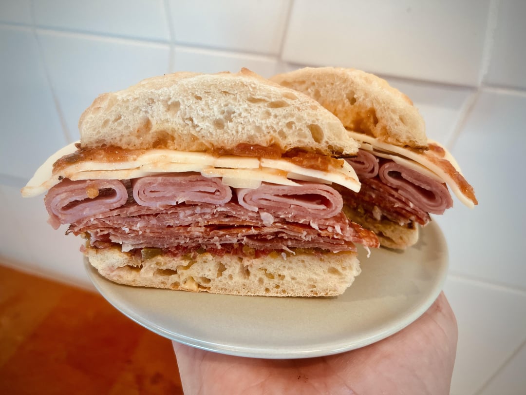 1. Costco: artisan roll, ham, 3 salamis, prosciutto. Kewpie mayo, Amora mustard, provolone, sharp provolone, onion/pepper relish (sweet), homemade pickled jalapenos and onion.