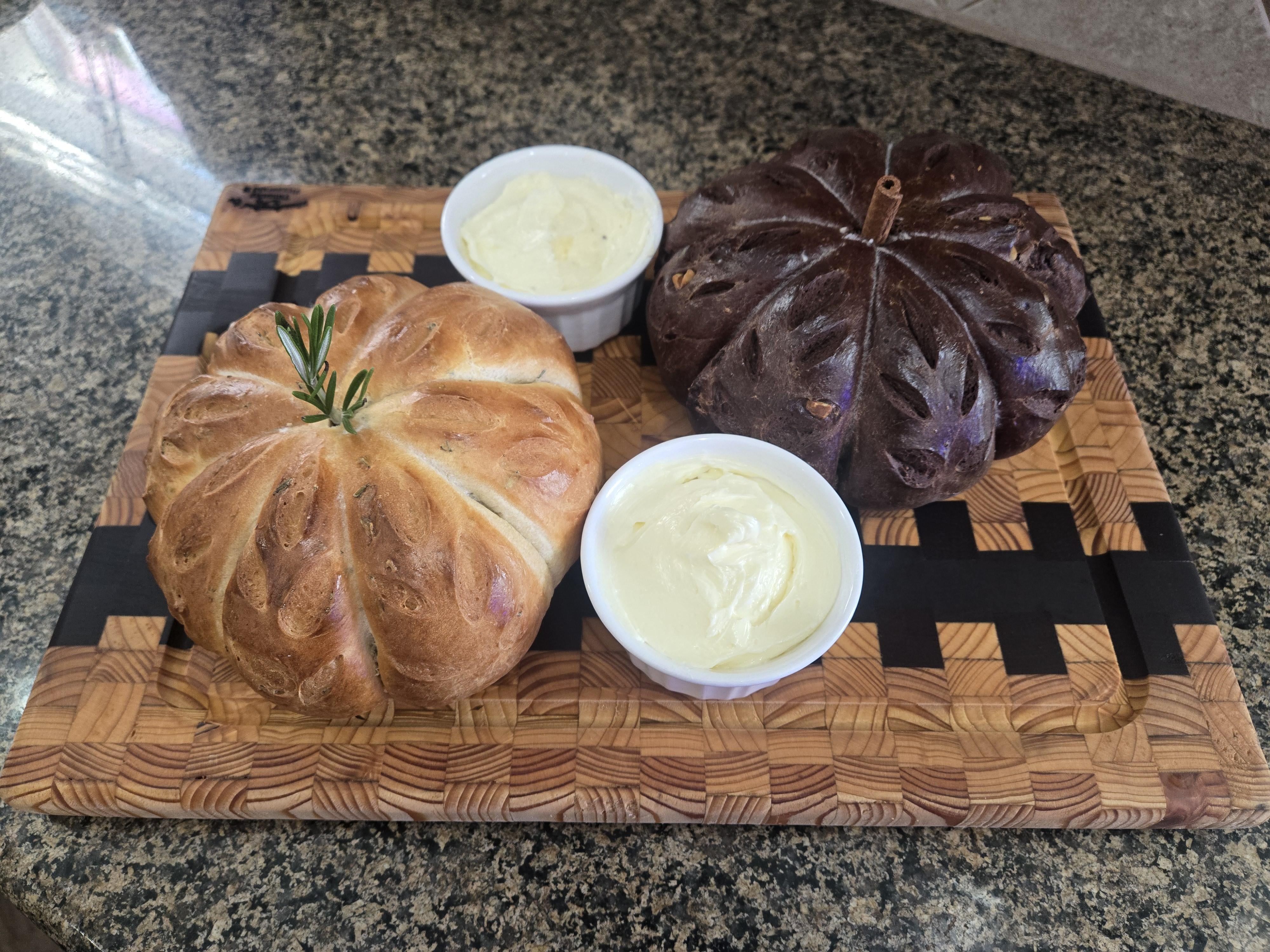 I was asked to bring bread to a fall dinner party so I made rosemary bread with a truffle salt compound butter and a chocolate walnut bread! Pumpkin shaped, of course.