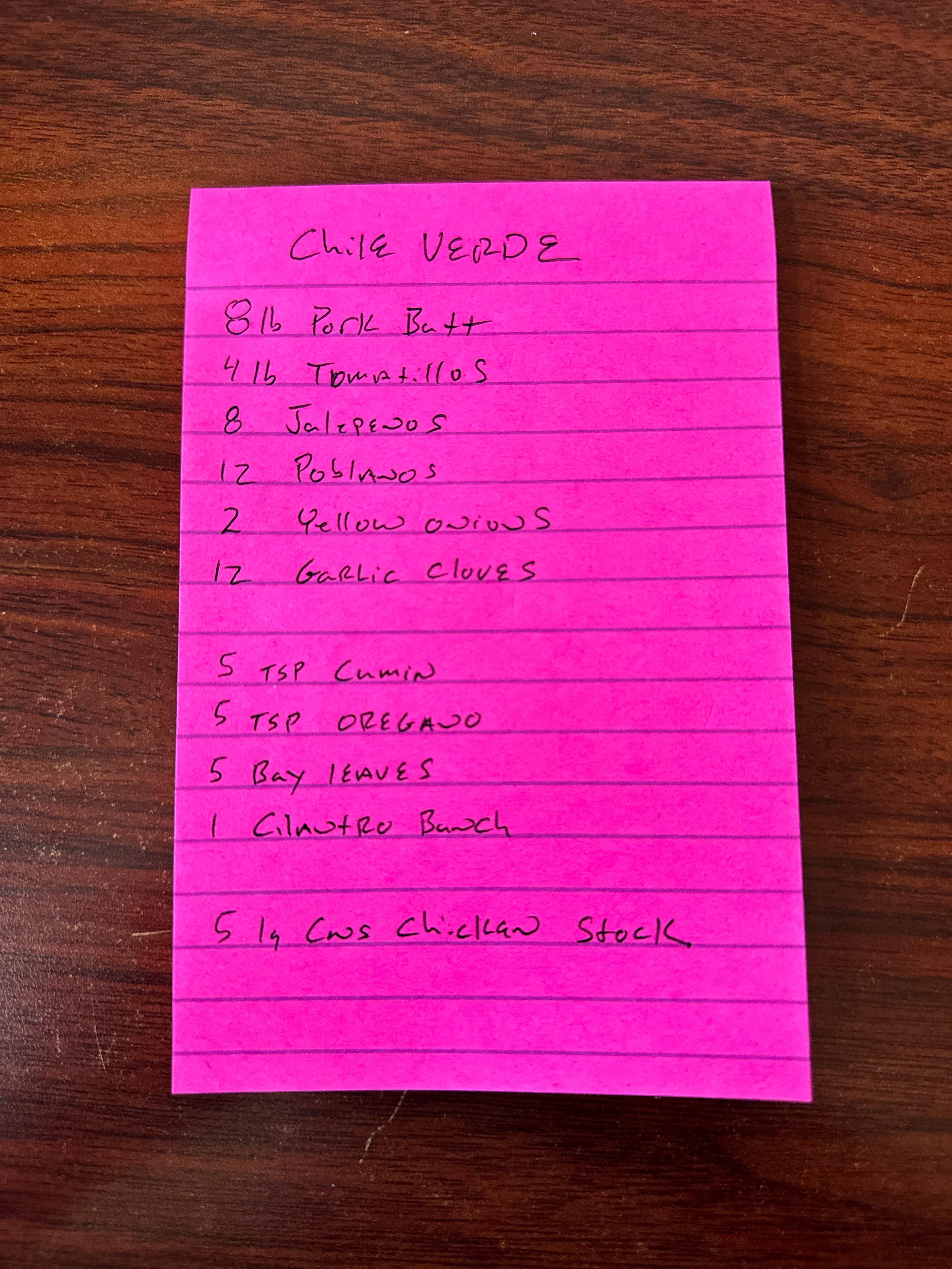 Ok all you Chile Heads…my wife lost my coveted Verde recipe long ago and I have been trying to recreate it over the years. I feel close but something is off. Check out my ingredients and let me know if anything pops out at you. Thanks