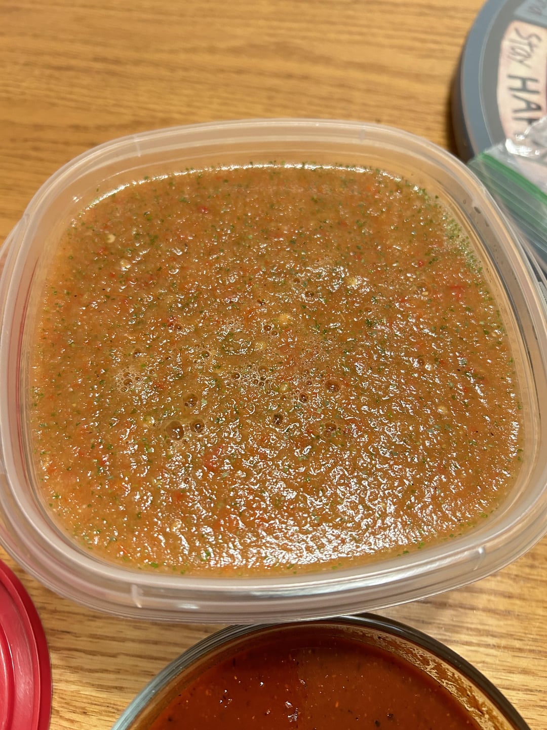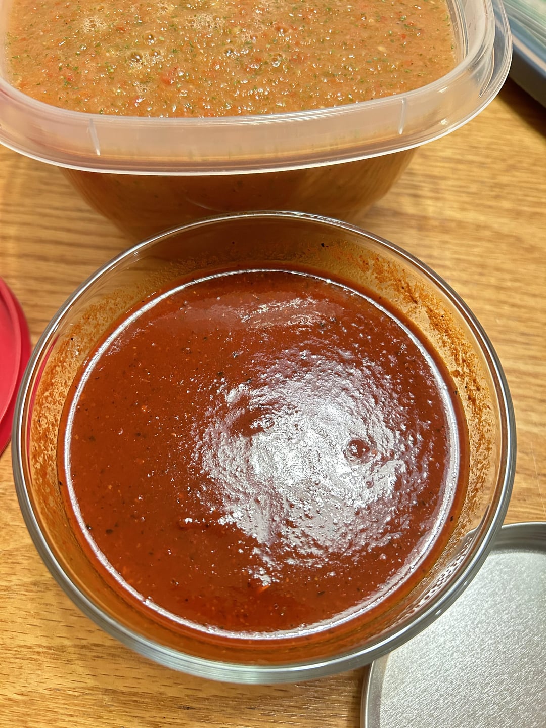 The third is a roasted jitomate, about 8 toasted red New Mexico hatch chiles, which I rehydrated. I blended it with a bit of the rehydration liquid mixed with a bit of bouillon, some roasted garlic, a little squeeze of lime (far cry from the other two lol), cumin, and salt. Then I cooked it down a bit with a little oil. It’s pretty good, only very slightly spicy, but such a nice earthy and rich flavor. I may braise some meat in this one.