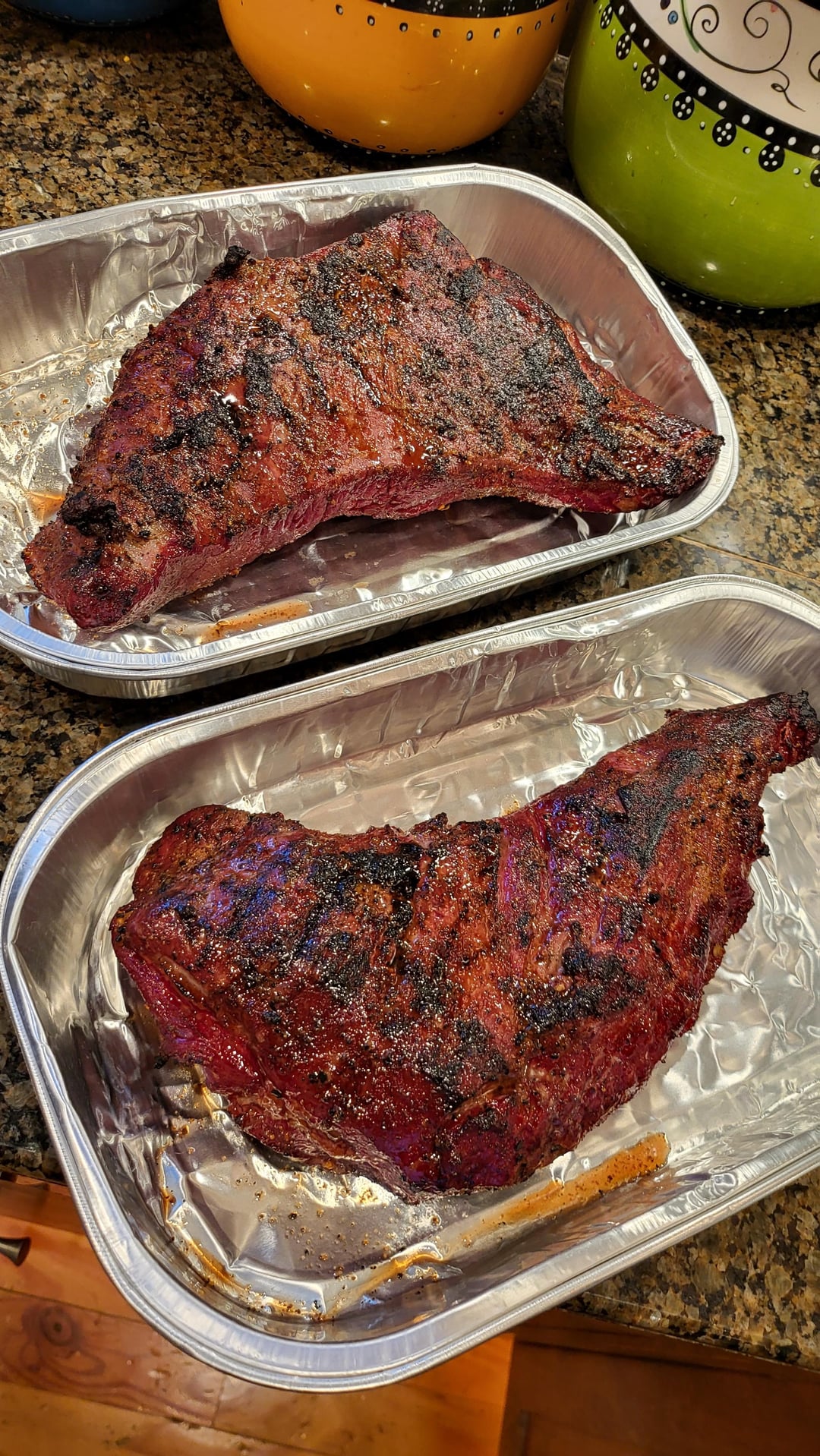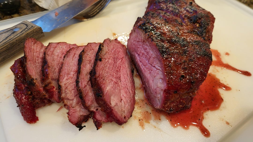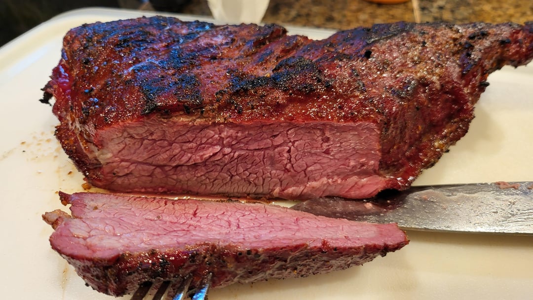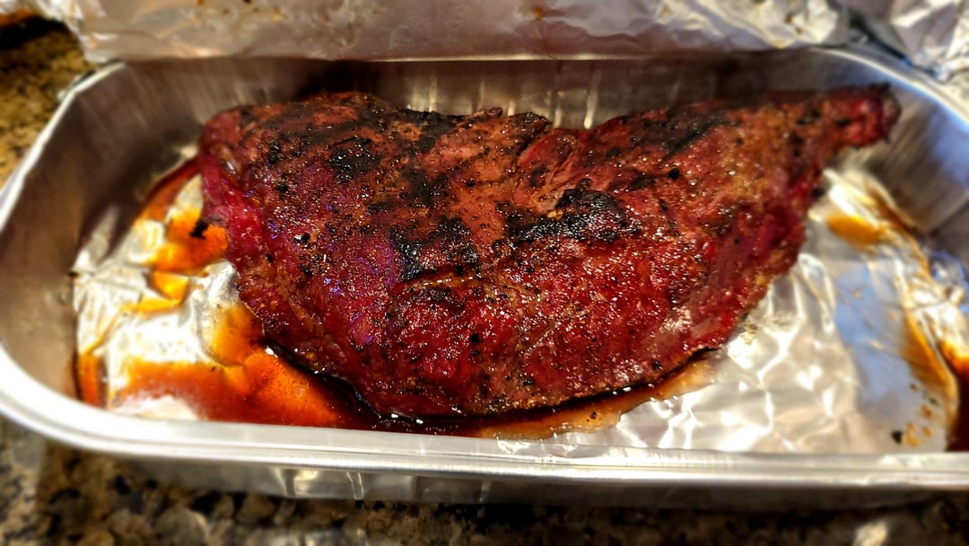 Two 2.5 lbs Tri Tips with a salt, pepper, garlic dry rub. Smoked to 120 degrees for about 2.5 hours roughly, then seared on my propane bbq for 2 minutes in each side, then put back in the smoker on high, untill reached 135 degrees.