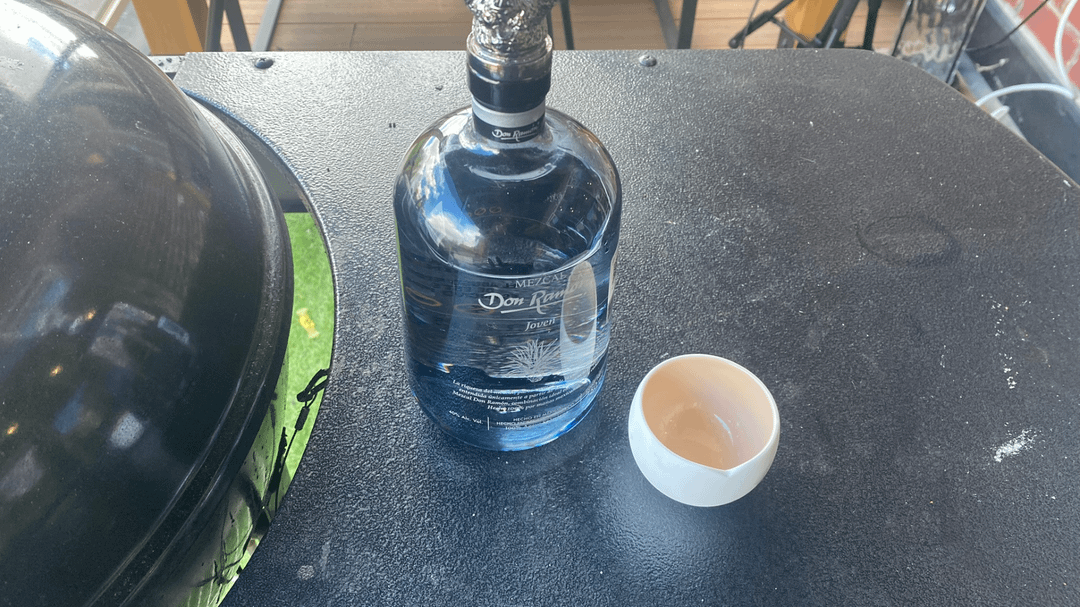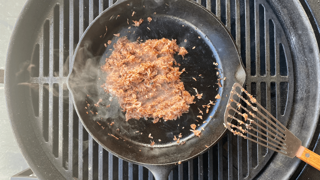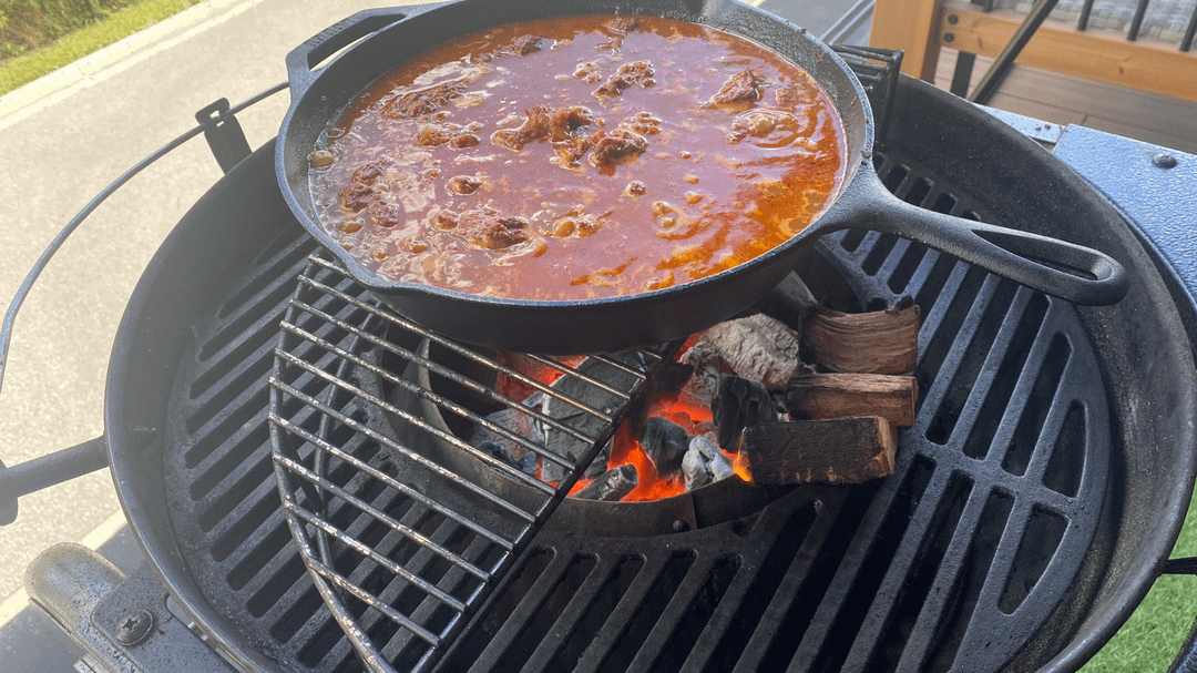 8. Add in beef to the pan and sautee for 5 min, add enough water to cover beef and smoke for 2 hours at 250 with apple wood chunks, also add 60ml of Feni (indian coconut/cashew alcohol) or any smokey liquor i.e Tequila/Mascal (Picture 10, 11)