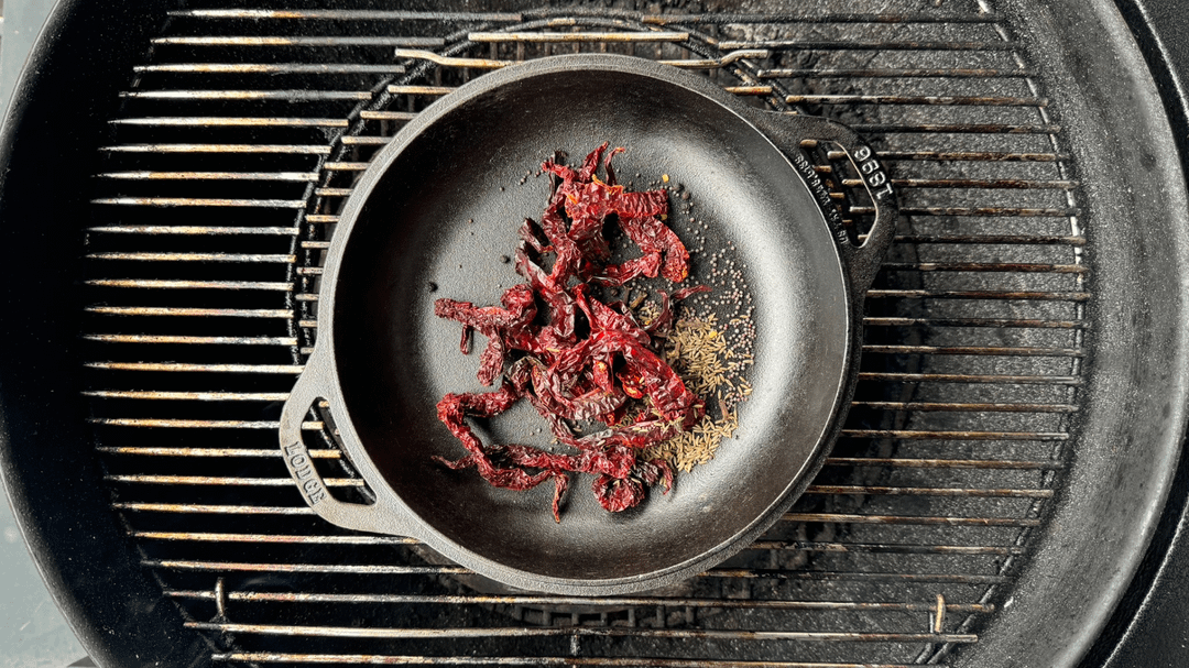 4. Toast dry spices – 20 Kashmiri chilis, 20 black peppercorns, 16 dried cloves, 2” piece of cinnamon, 2 teaspoons cumin seeds, 1 teaspoon mustard seeds (Picture 6)