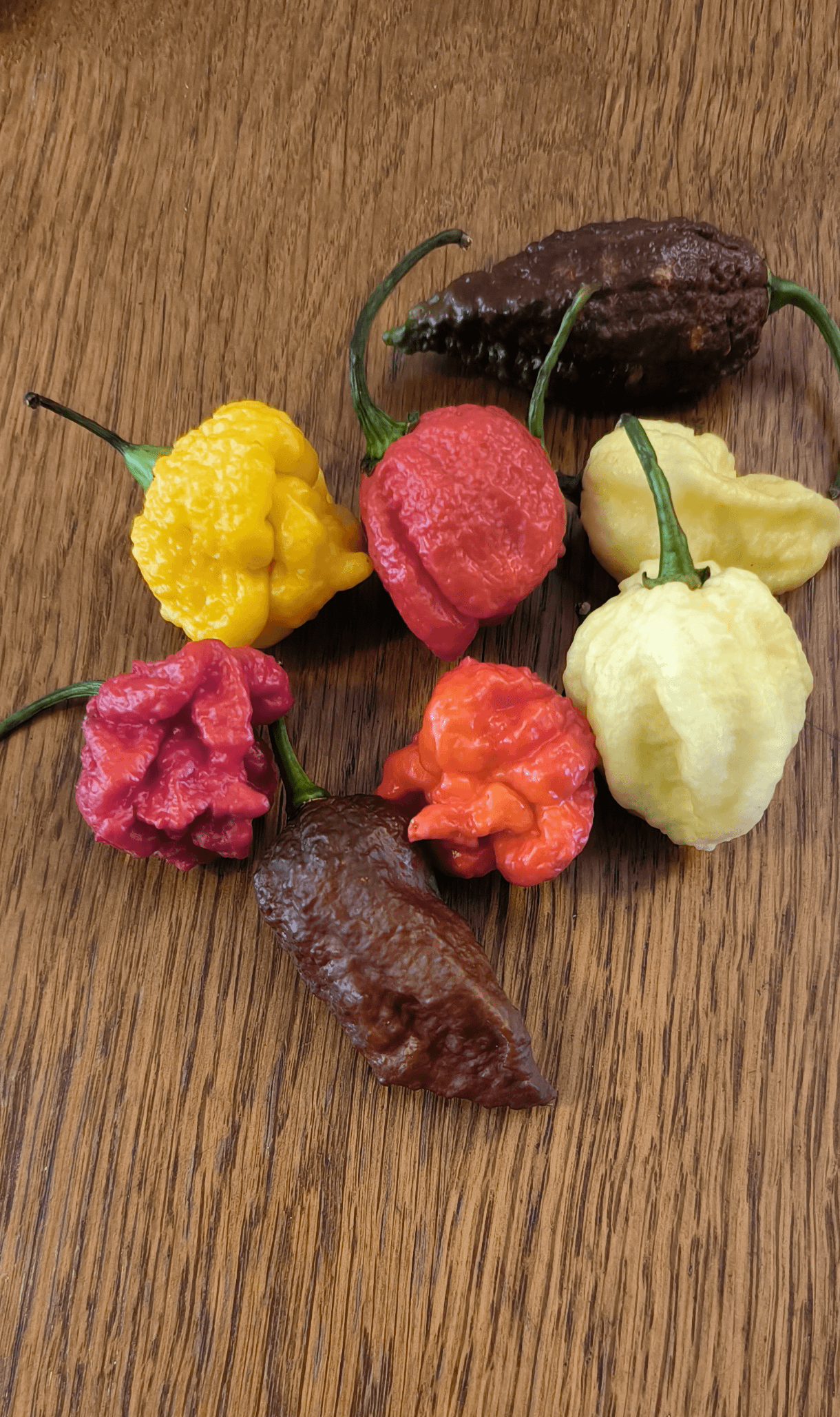 I got my hand on these beautiful hot ones on a market for 50c each, but not sure what they are. I know one of them is chocolate bhut jolokia, and red ones are Carolina (if I'm not wrong). Does anyone knows the white and yellow?