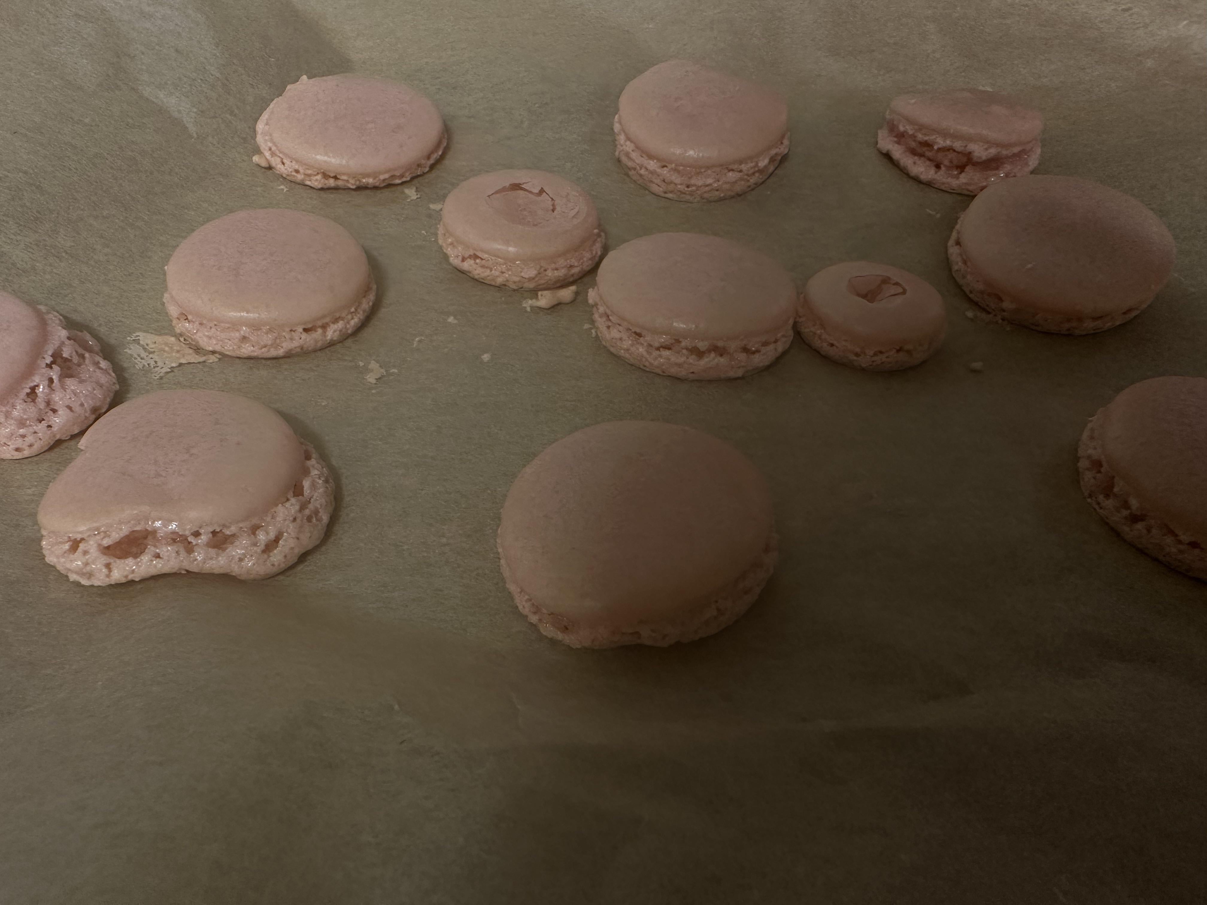 I use a mixer till stiff peaks and add 1/4 cup of white sugar and 1/2 teaspoon of vanilla and gel food coloring I then mix that with 2 cups of powdered sugar and 1 cup of almond flour, I make sure to “beat” the air out of the mixer, I then let it sit for at least an hour and bake them at 15-17 minutes at 300F. For the macronage part, I have made sure I don’t over mix and don’t under mix, I even tested out different mixing and placing them next to each other to see a difference and they still come out flaky. For these specifically I didn’t over mix just to make sure. I have no idea what I’m doing wrong 😅