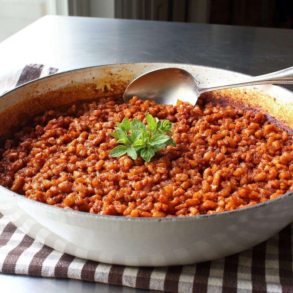 This recipe (with a couple of easy tweaks to replace butter and chicken stock with olive oil and veg stock) is one of my favorite goto meal prep options. Its great on its own, with beans and avocado, in tacos, or even just a base for a grain bowl.