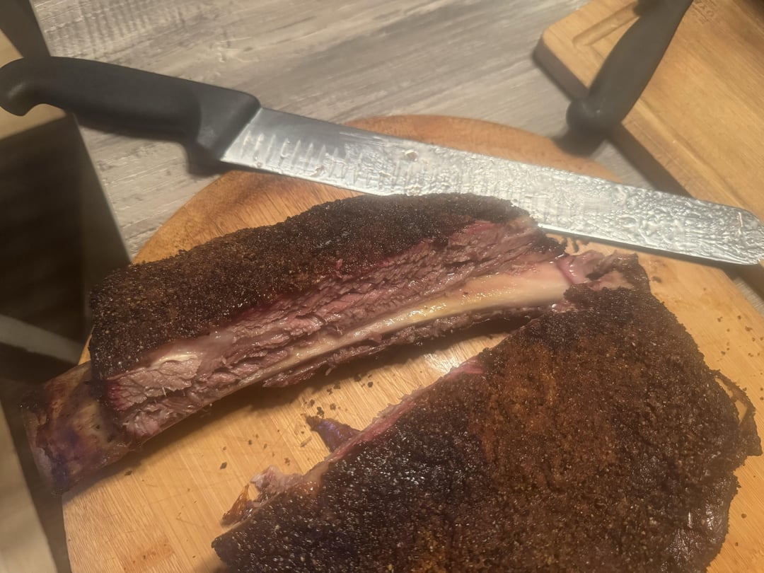 These are whole beef short ribs. For my rub I used Meat Church, Holy Cow rub with extra kosher salt. I put them on at midnight at 225 degrees, and took them off at 2 PM when the temperature hit 201. They came out great, they’re so tender that you can just shake them off the bone without even cutting them. Might be the best ones I’ve made so far!