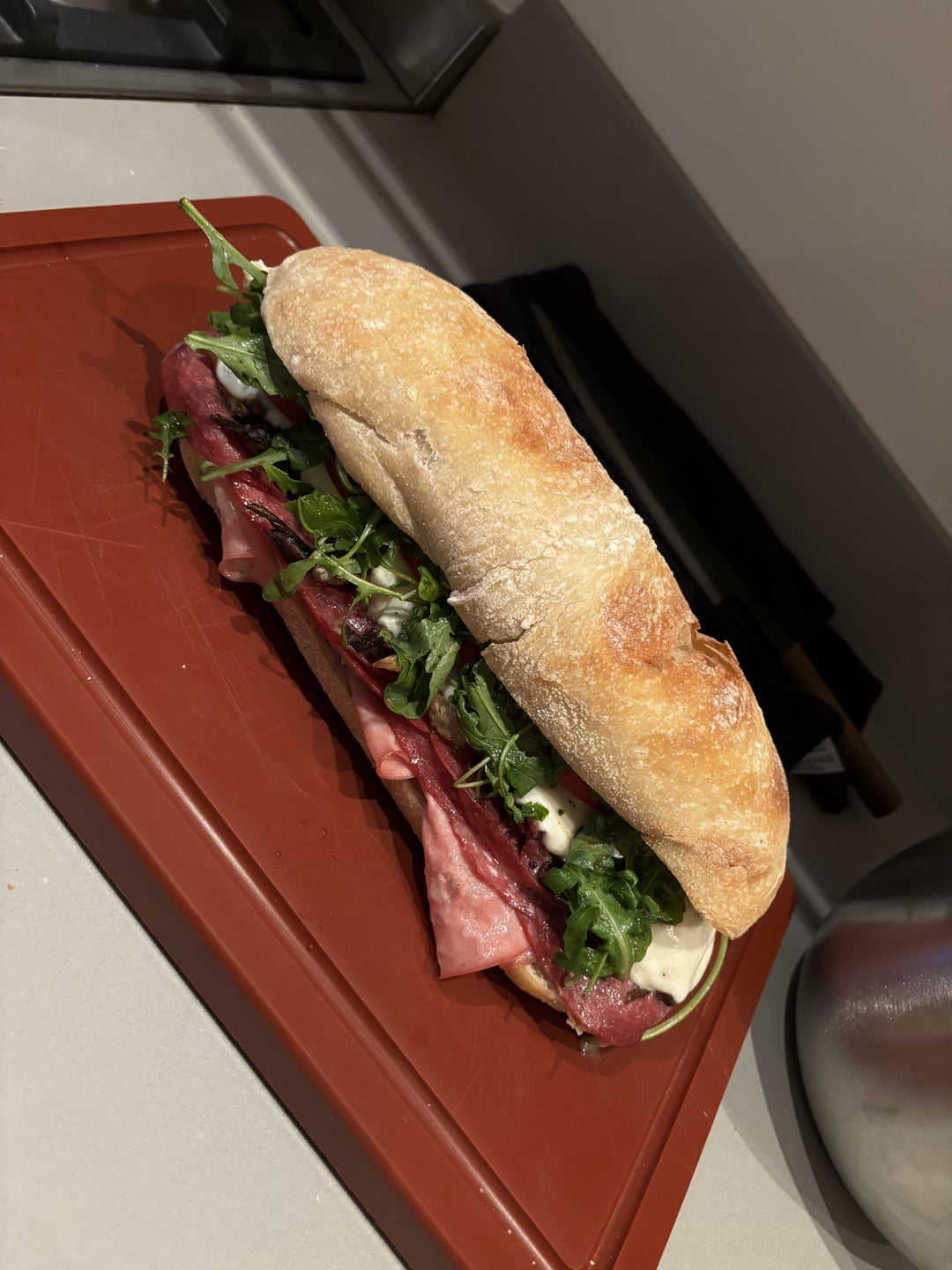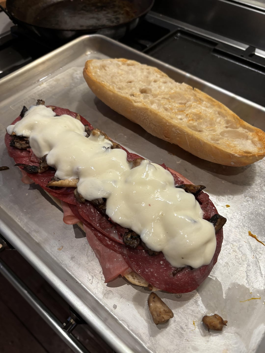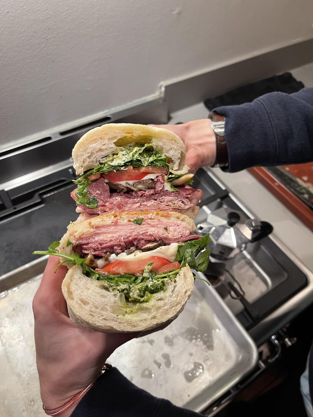mortadella, salami, lamb hash, “beenham” sautéed mushrooms, melted mozzarella, arugula dressed in E.V.O.O, cocktail tomatoes, with mustard, coriander paste and artichoke dip, all on a ciabatta 🫠🫠