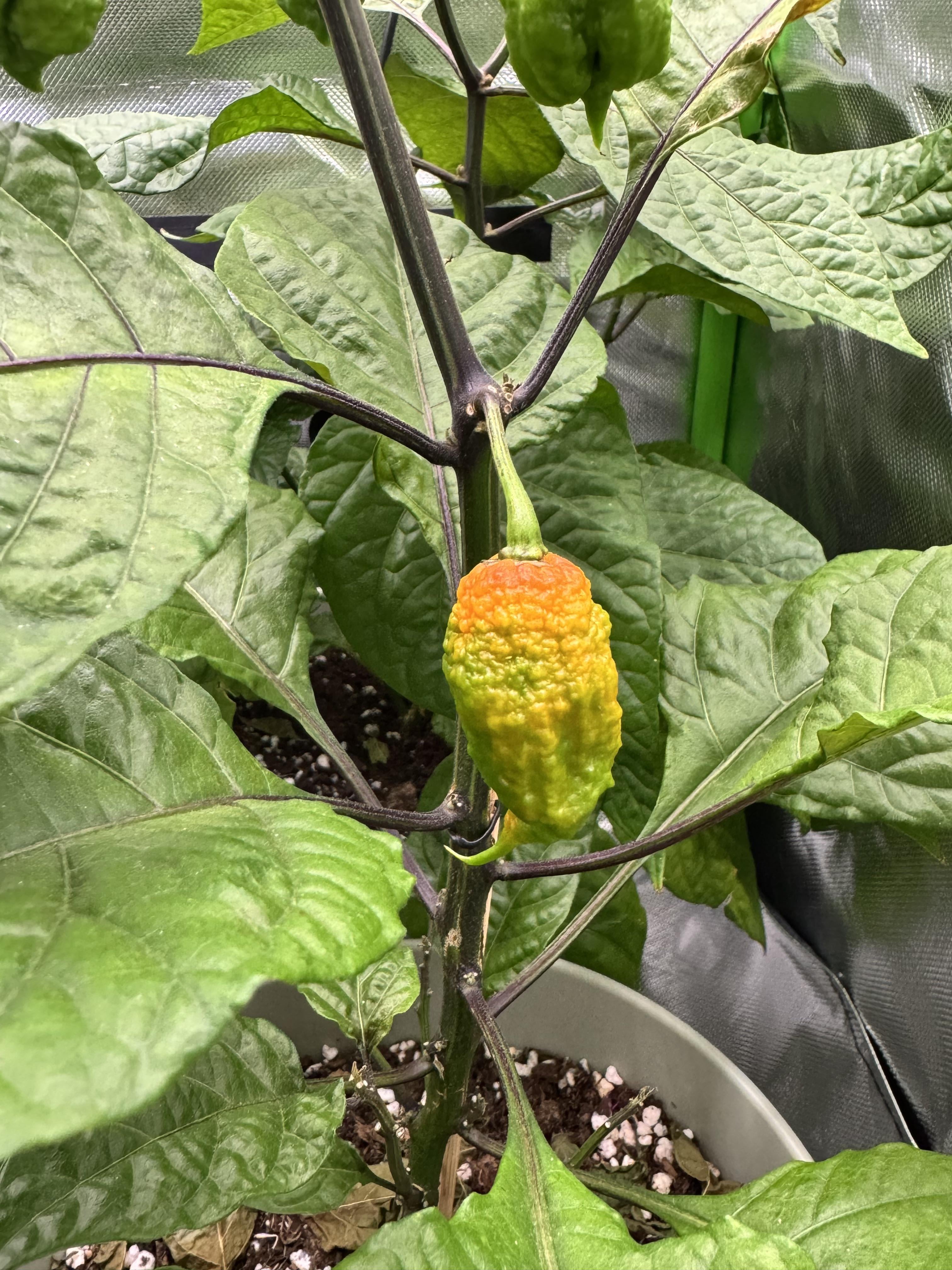 First year growing. After a little bit of dead leaves due to moving into a tent for the first time and giving them too much light, I was worried that these guys wouldn't survive. After decreasing light levels, the first chili is now riping. This is day 3 since I started to notice this color change.
