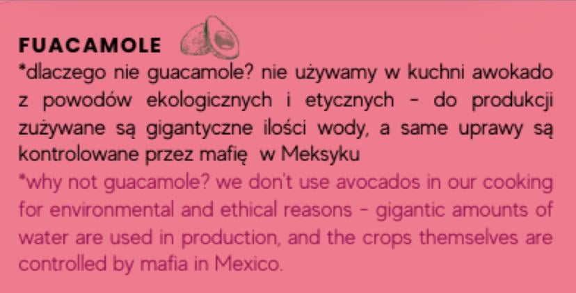It’s cheaper and easier to use a substitute like edamame or peas for guacamole in a restaurant setting — though I think it’s not guacamole at that point. Avocados are expensive, ripe for 12 seconds, and time consuming to serve while ripe before they aren’t good anymore. I’m betting that’s the actual reason for this note.