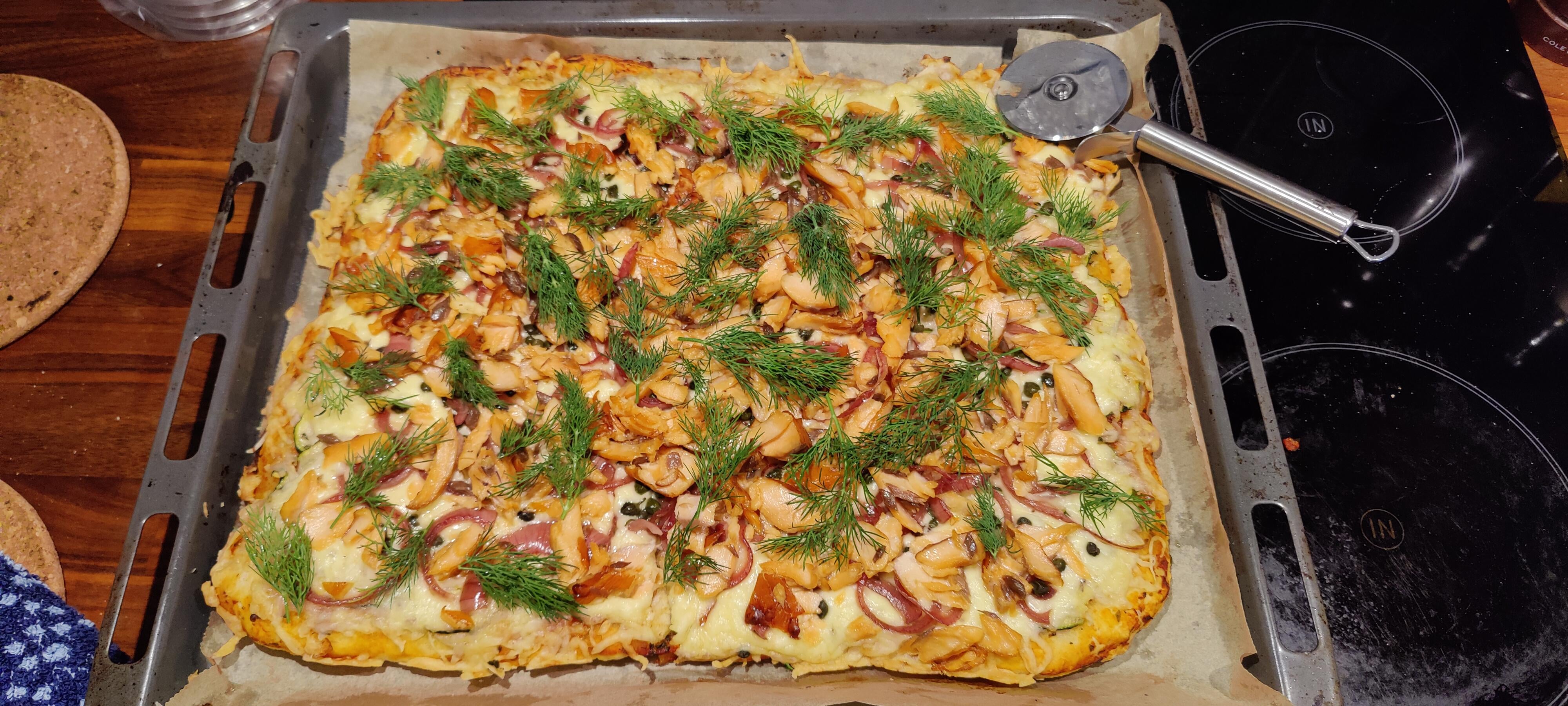 sesaman 1 year ago Copypaste of the description for RES users:> It’s smoked salmon, dill, pickled red onion and capers on a base of tomato sauce and marinated zuccini slices, with plenty of cheese of course.