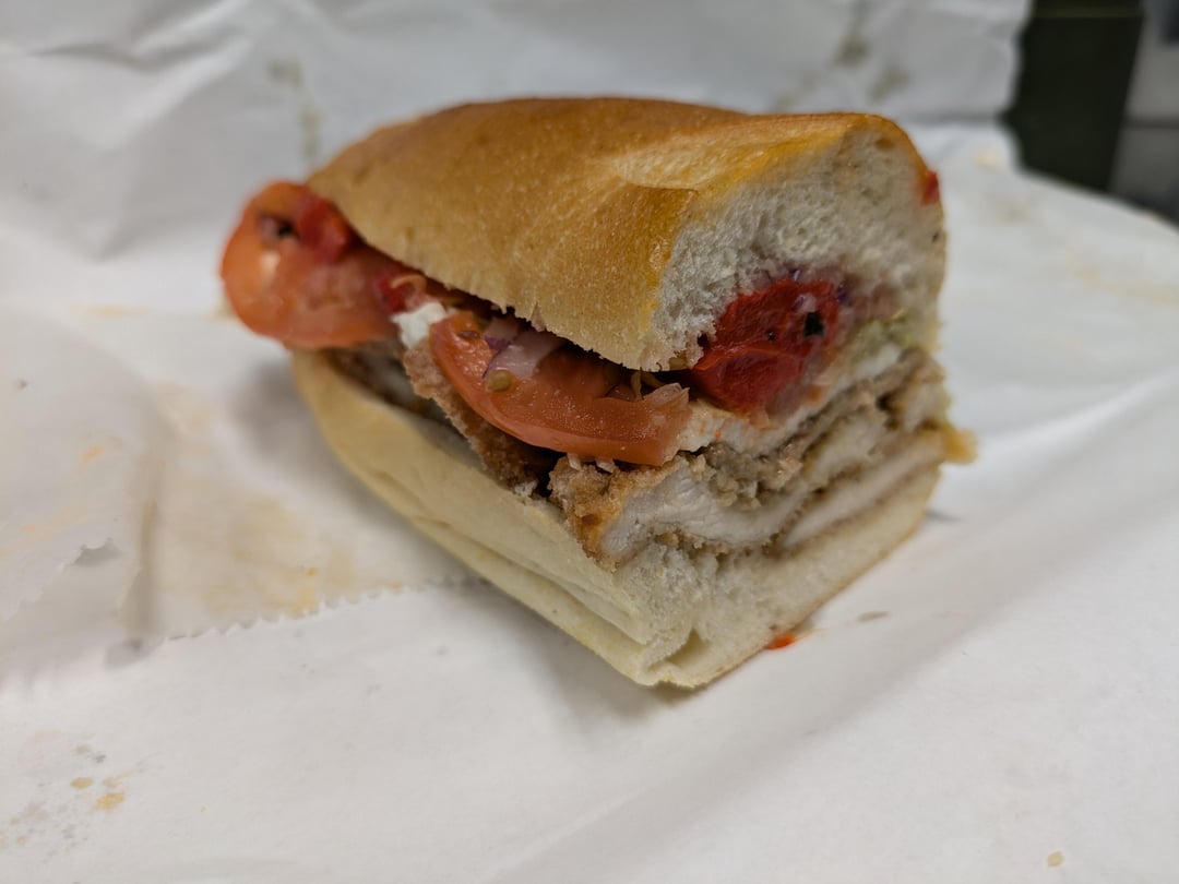 Chicken cutlet, mozzarella, eggplant, roasted peppers, lettuce, tomatoes & onions on a wedge.