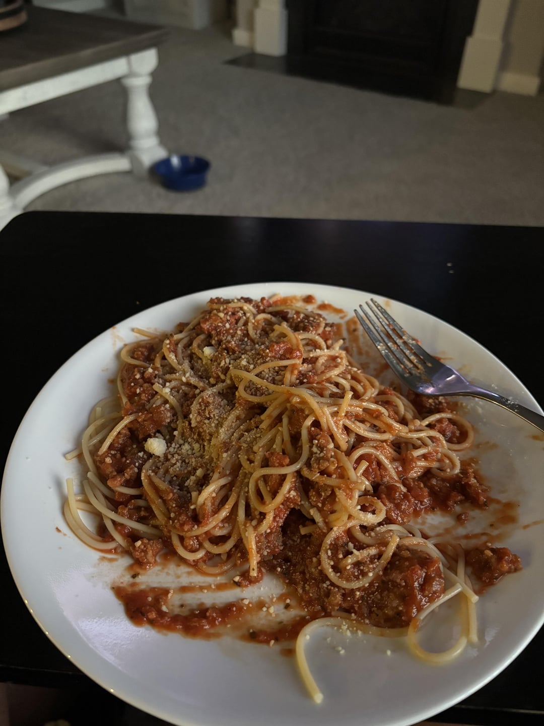 So I decided to try and make spaghetti like I make over the top chili. I used two pounds of ground beef and 4 Italian sausages to make the ball. I also added bread crumbs, milk, 2 eggs, Parmesan cheese and some meat church garlic and herb seasoning to make the ball. I used two jars of ragu sauce and put it in a Dutch oven. After the meat was cooked I crumbled it up and added it to the sauce. Just like the over the top chili this method took the spaghetti to another level. Side note: I made the noodles on the side and just topped them with the meat sauce.