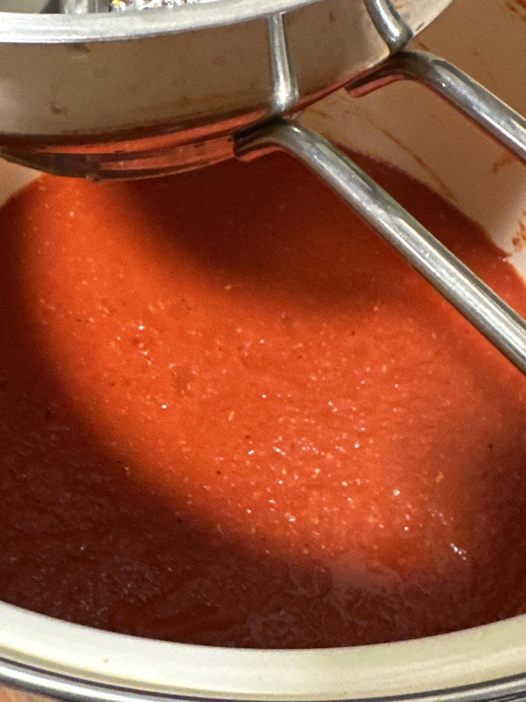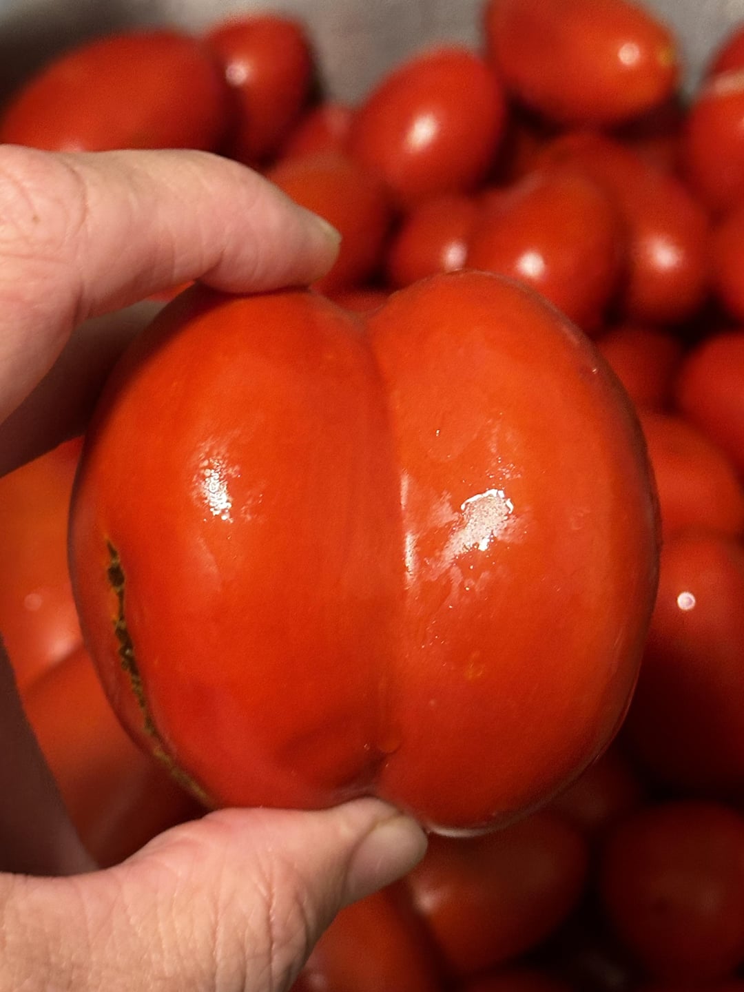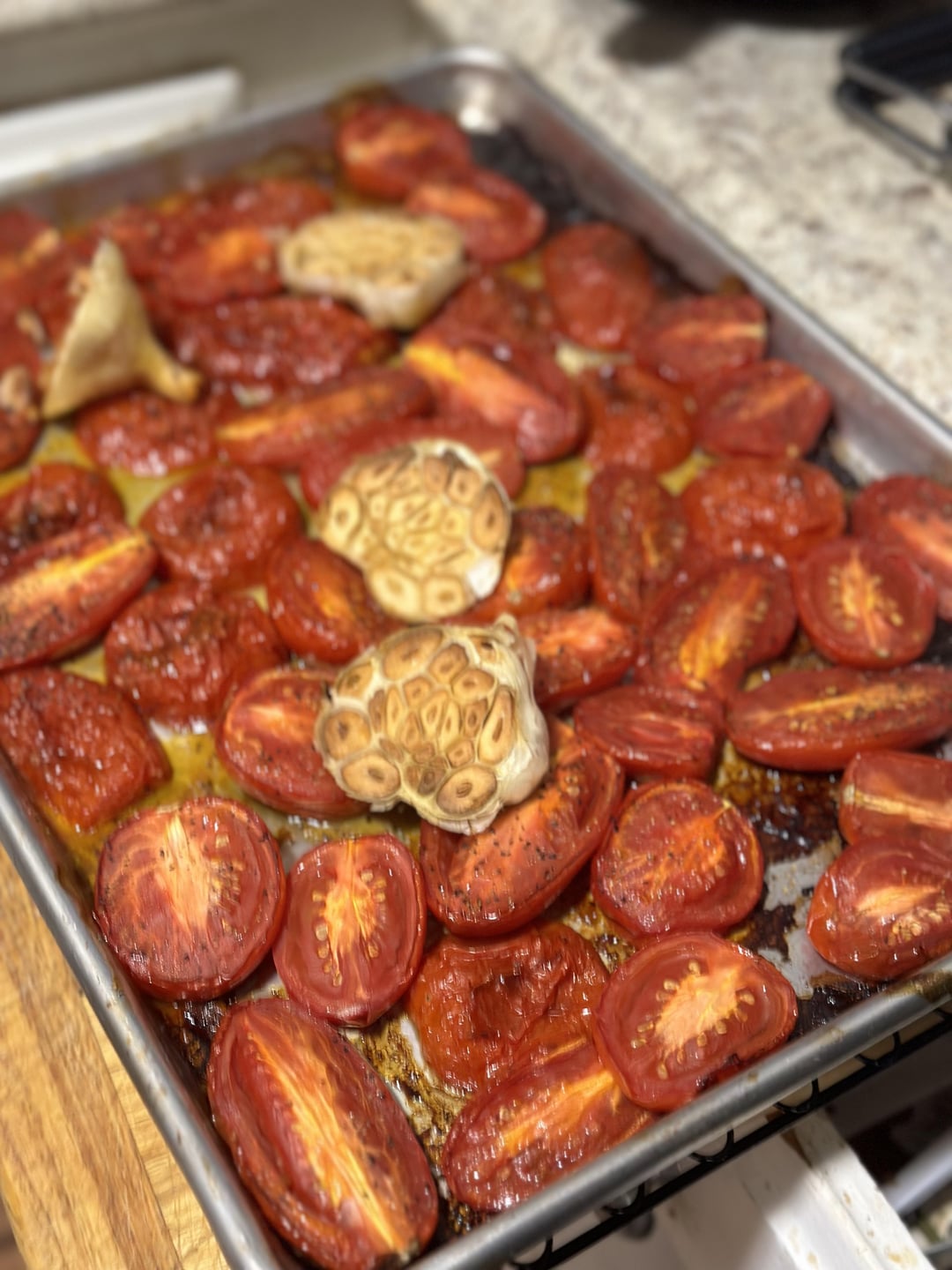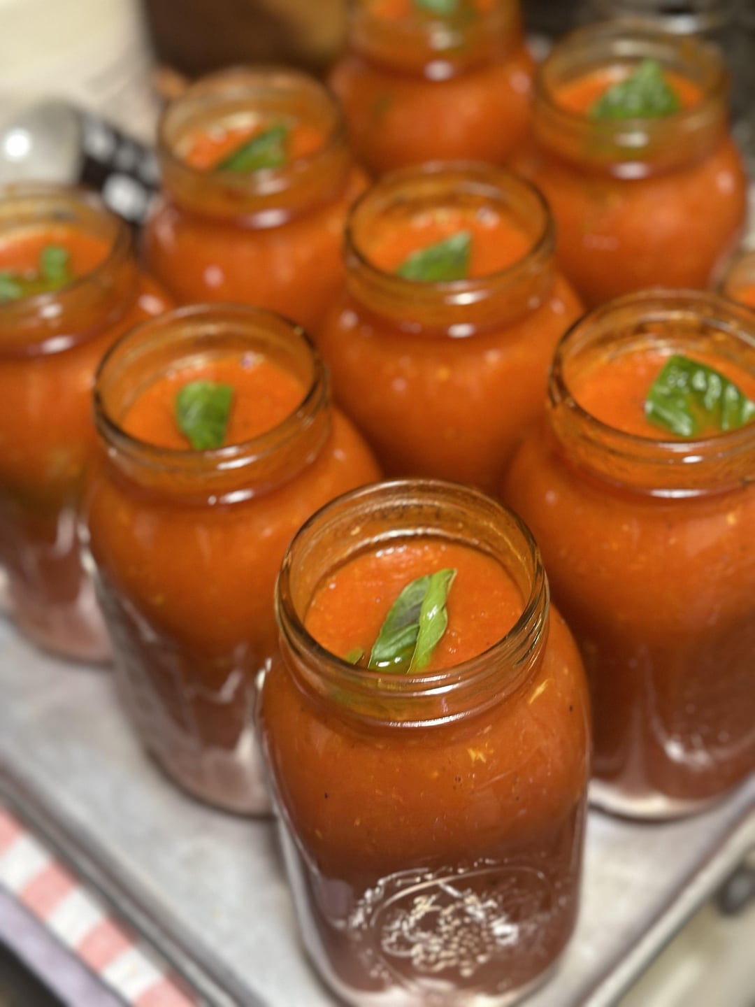 I’ve canned marinara sauce before but this was the first time doing a basic tomatoe sauce. I roasted 36 pounds of tomatoes, four heads of garlic and two large onions over two days. On the second day I reheated the sauce, added lemon juice and a sprig or two of basil before putting the heated sauce in the jars and processing as called for in recipe. Now I just need to find room for eight and half quarts of sauce!