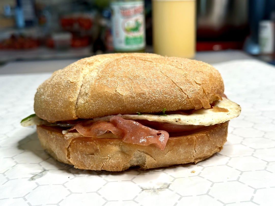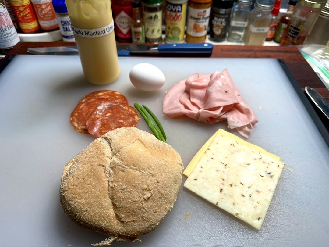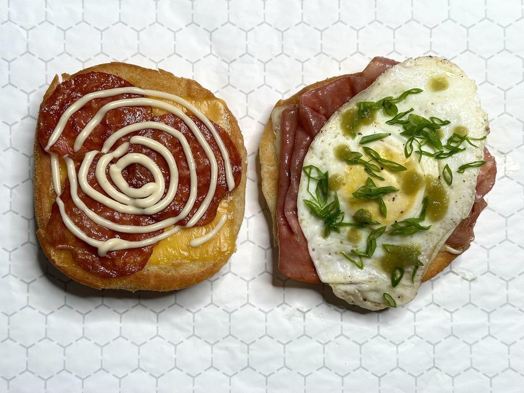 Egg over medium, scallions, pan-fried super-thin deli-sliced mortadella and Spanish Chorizo, American, pepper Jack, homemade maple mustard aioli, and some green habanero hot sauce.