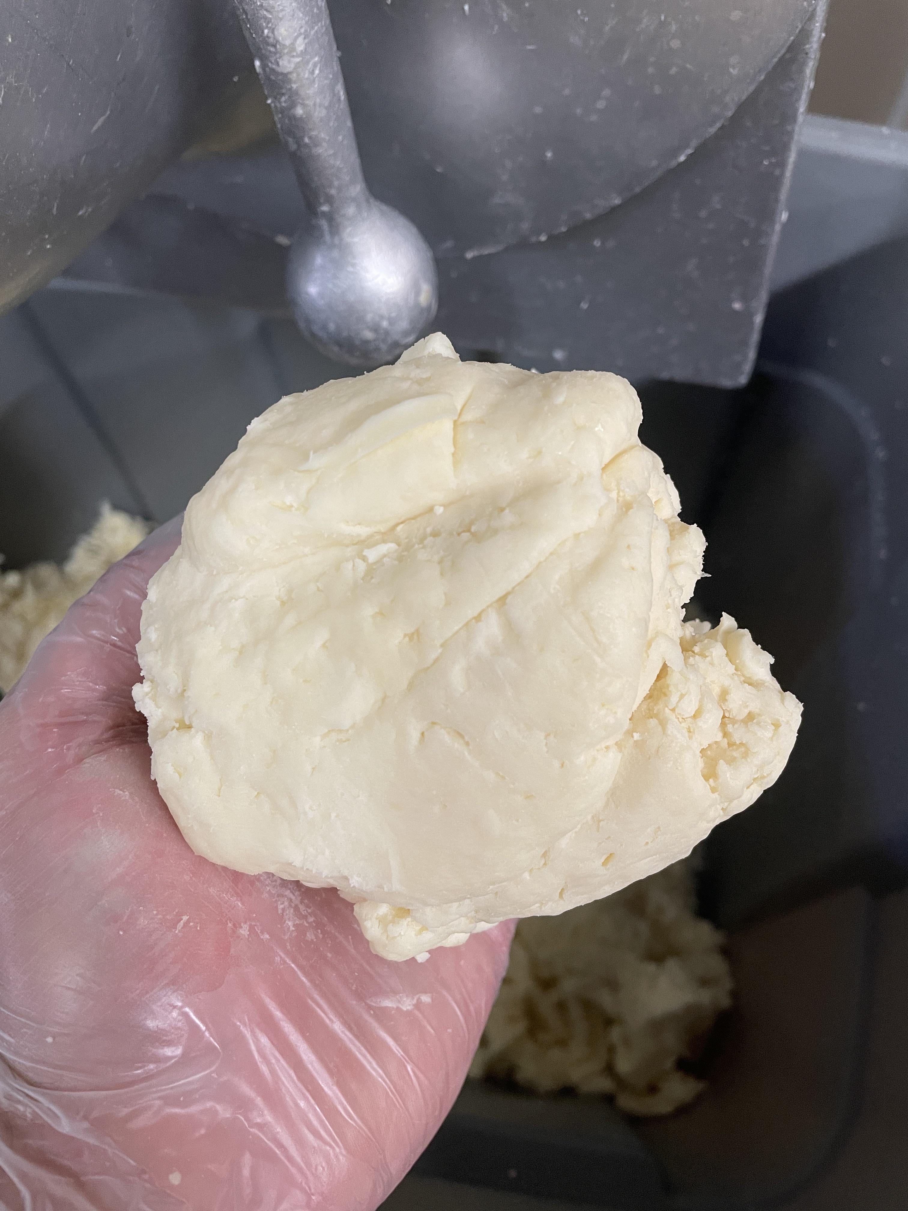 I used to use a big hobart like that to shred tons of cheese and get those weird globs in your picture. The trick is to just grab the globs out between blocks of cheese and throw it back in the hopper before shoving in your next block and it gets shredded into the pile like the rest. You’ll inevitably end up with a little bit of a glob at the end, but you can end up with far less than you did if you pull it out then ram it through with another block. We used to call that glob at the end “cheese snack” cause it’s pretty spreadable, and is nice for a snack after you’ve shredded all that cheese.
