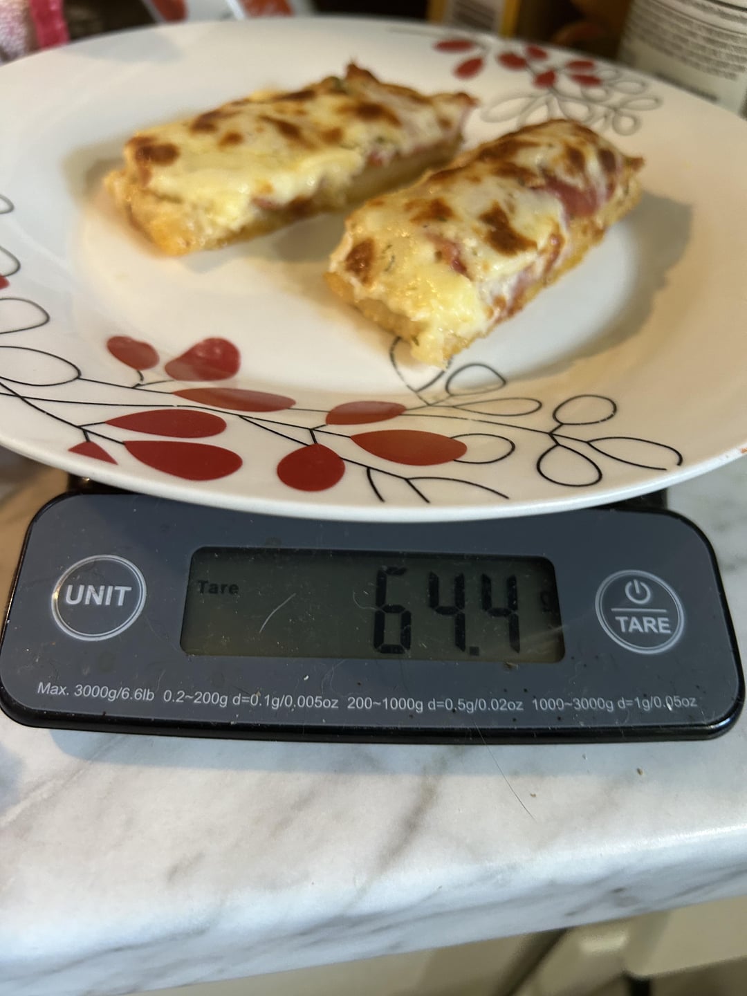 Two pieces weigh around 64 grams. Also used hand for scale-reference.