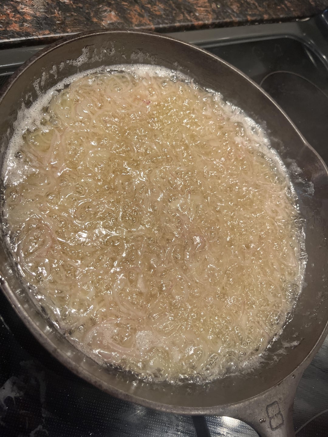 Easy recipe,avocado oil infused from a dozen deep fried shallots, gochugaru, crushed red pepper, dash of: sugar, soy sauce, MSG