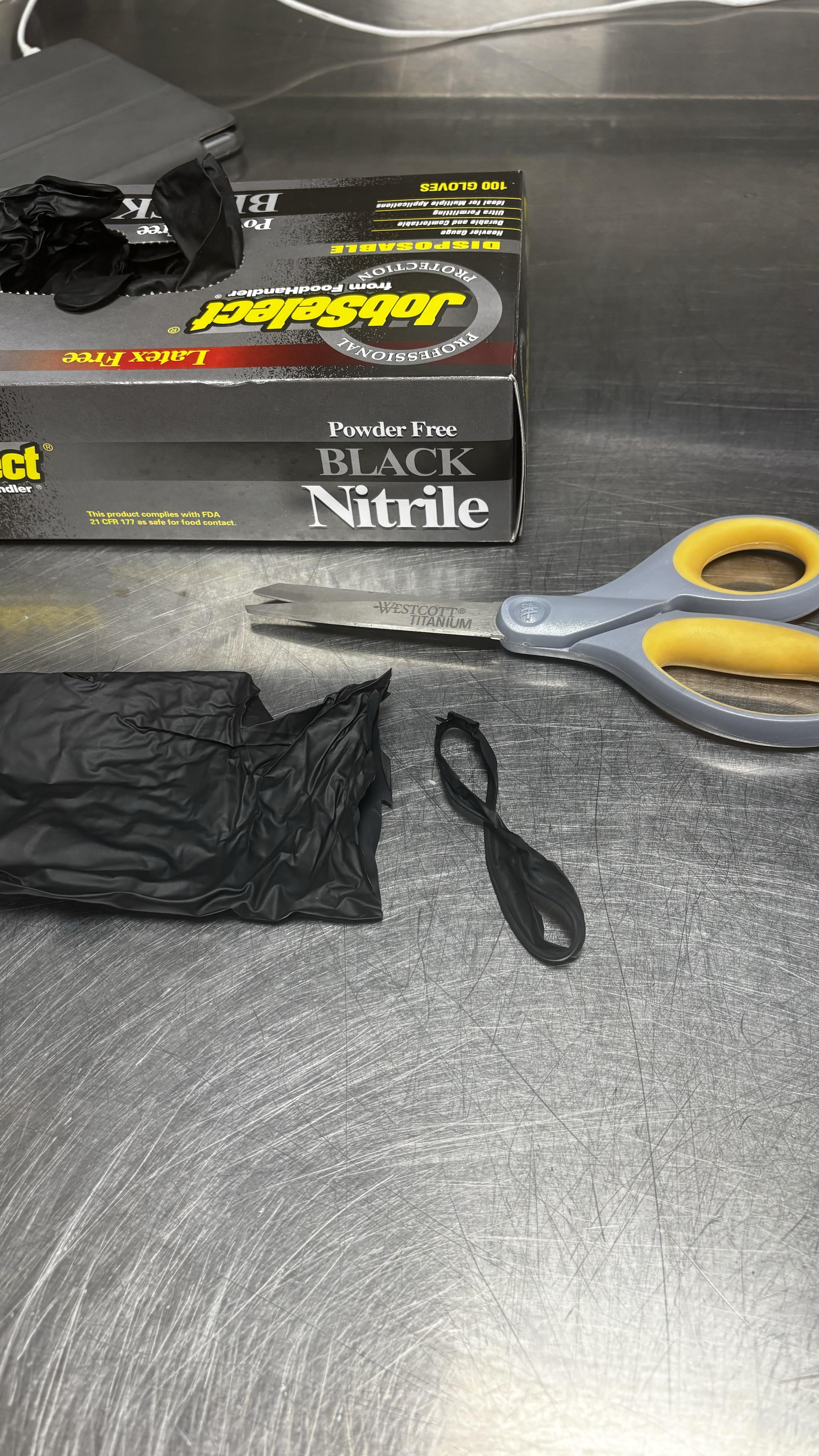 I’m in a nursing home kitchen and have found that the little elastic loops off the sides of a face mask make a good hair tie in a pinch.