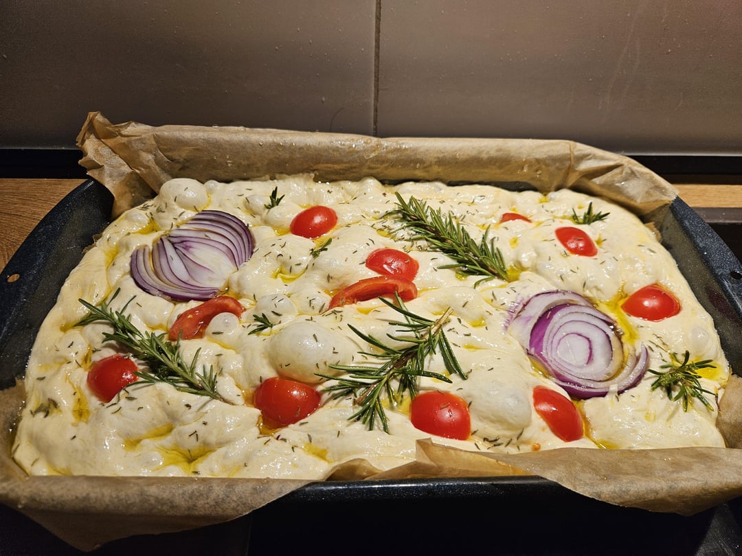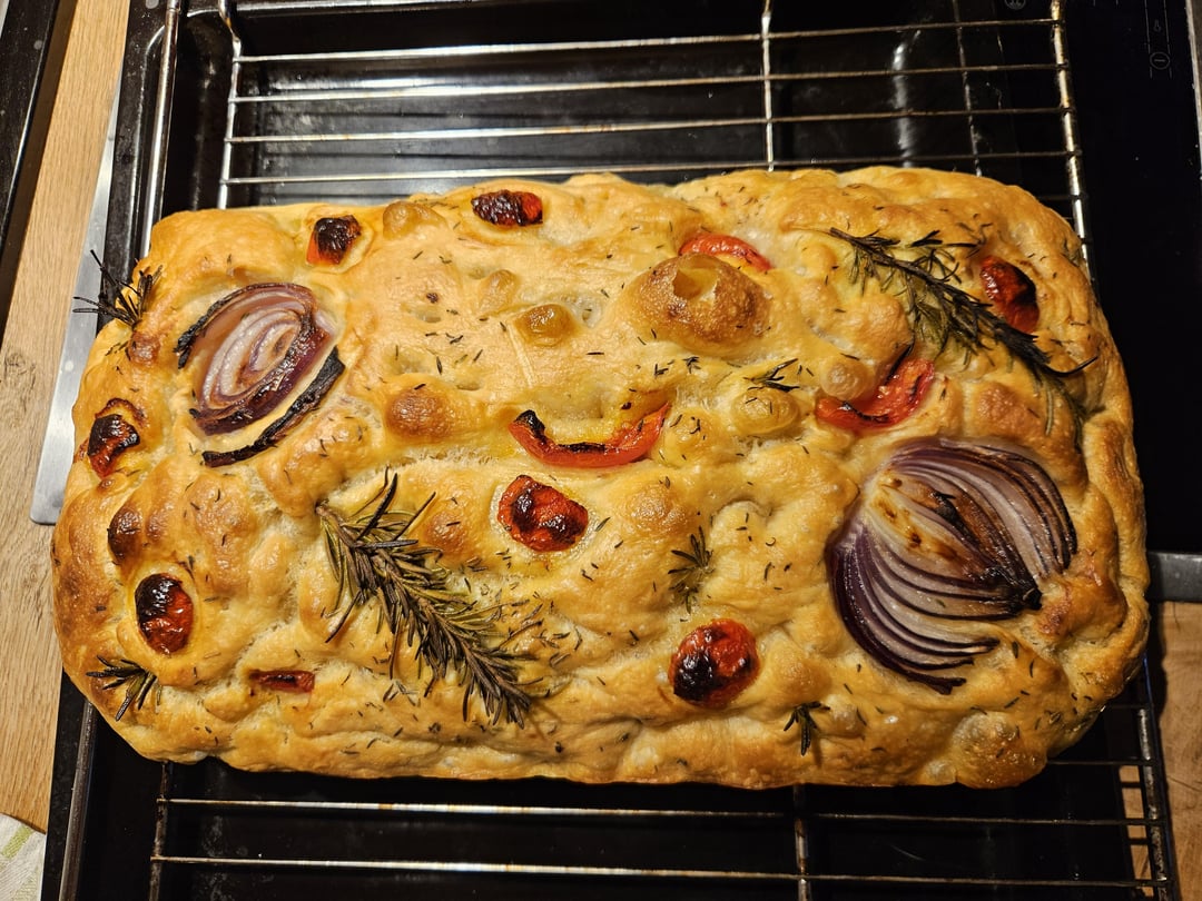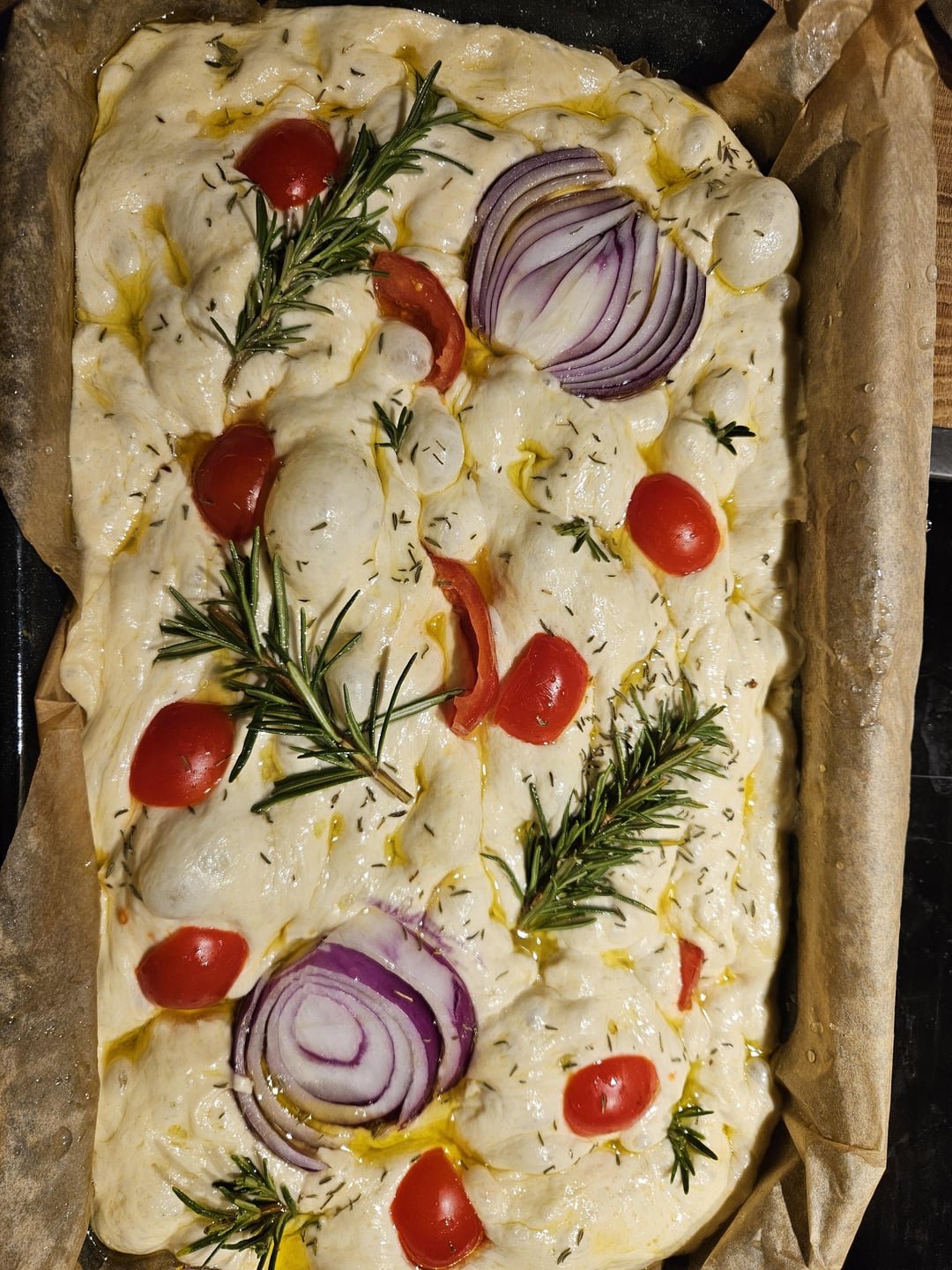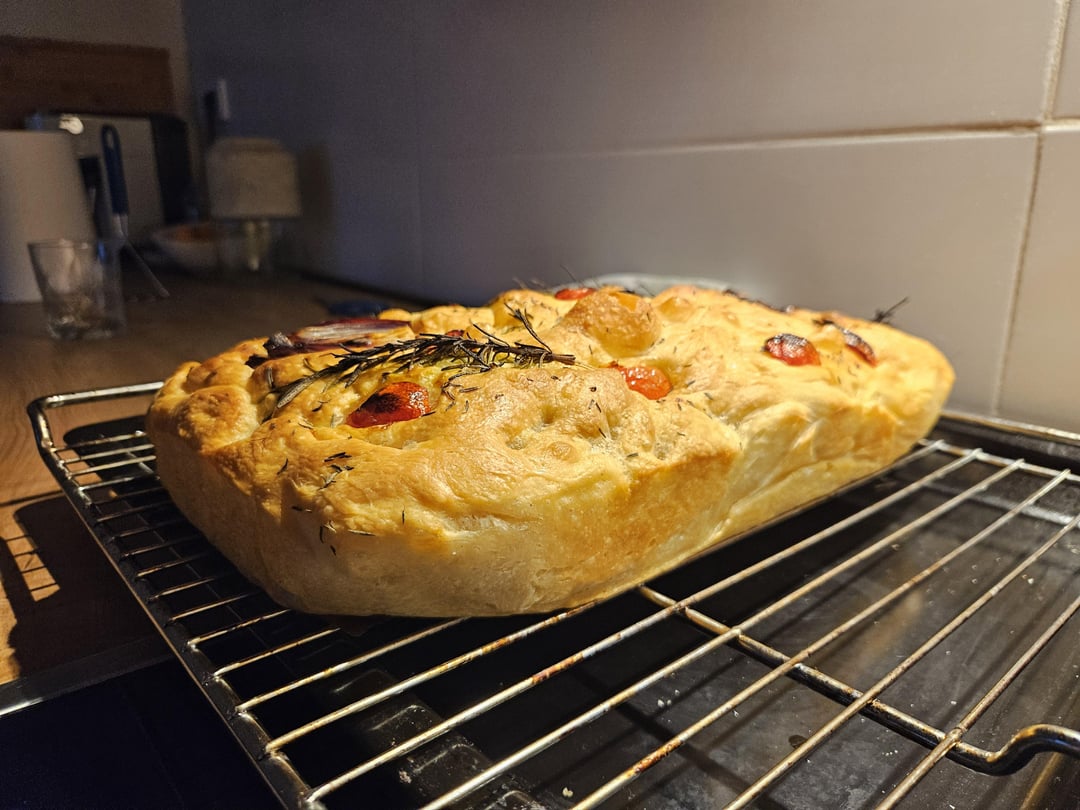 That is so beautiful! The only thing I would add is more dimples! Really dig your fingers through to give it that focaccia umpf. I press my fingers down the the bottom and even wiggle them a little bit. The dough will push out anything less. Nom nom nom