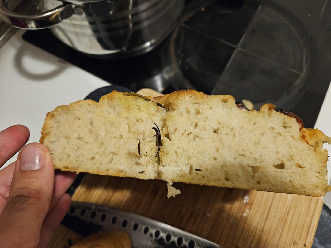 I’m going to go at a 7/10, but not for the reason you might imagine. The bread looks perfectly fine, little less bubbly than normal, but that happens. No, the missing points are for the whole rosemary twigs. Not only is the flavor likely to be overpowering in that area, rosemary in that format is nearly inedible. While I like the look, I don’t like the choice of either chewing essentially a line one for texture, or having to remove it prior to eating.