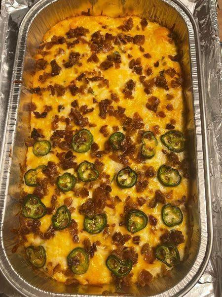 4. Put into a greased casserole dish ( olive oil or avocado spray, top with reserved cheddar, bacon and slice jalapeño ( optional)