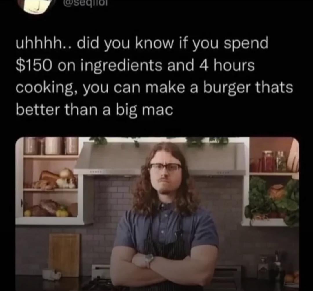 I mean, grocery store patties, thousand island, any cheese better than Kraft singles and some onions makes a burger better than a Big Mac and that costs like $25 for 6-8 of them.