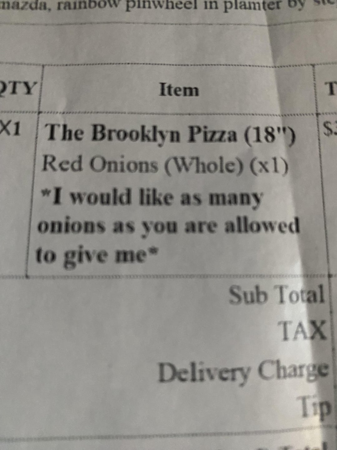 If I ordered a pizza “with onions” and I received this I’d probably say “ok”, but if I’d ordered like they ordered it and received this, I’d be kind of upset tbh.
