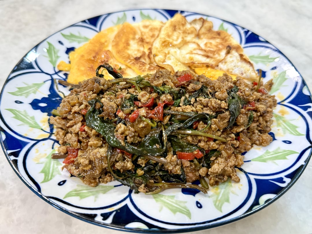 – Add the sweetener, fish sauce, soy sauce, dark soy sauce, and mushroom powder. Stir-fry for another minute and deglaze the pan with the broth or water. Because your pan is over high heat, the liquid should cook off very quickly. Add the basil, and stir-fry until wilted. Serve over rice.
