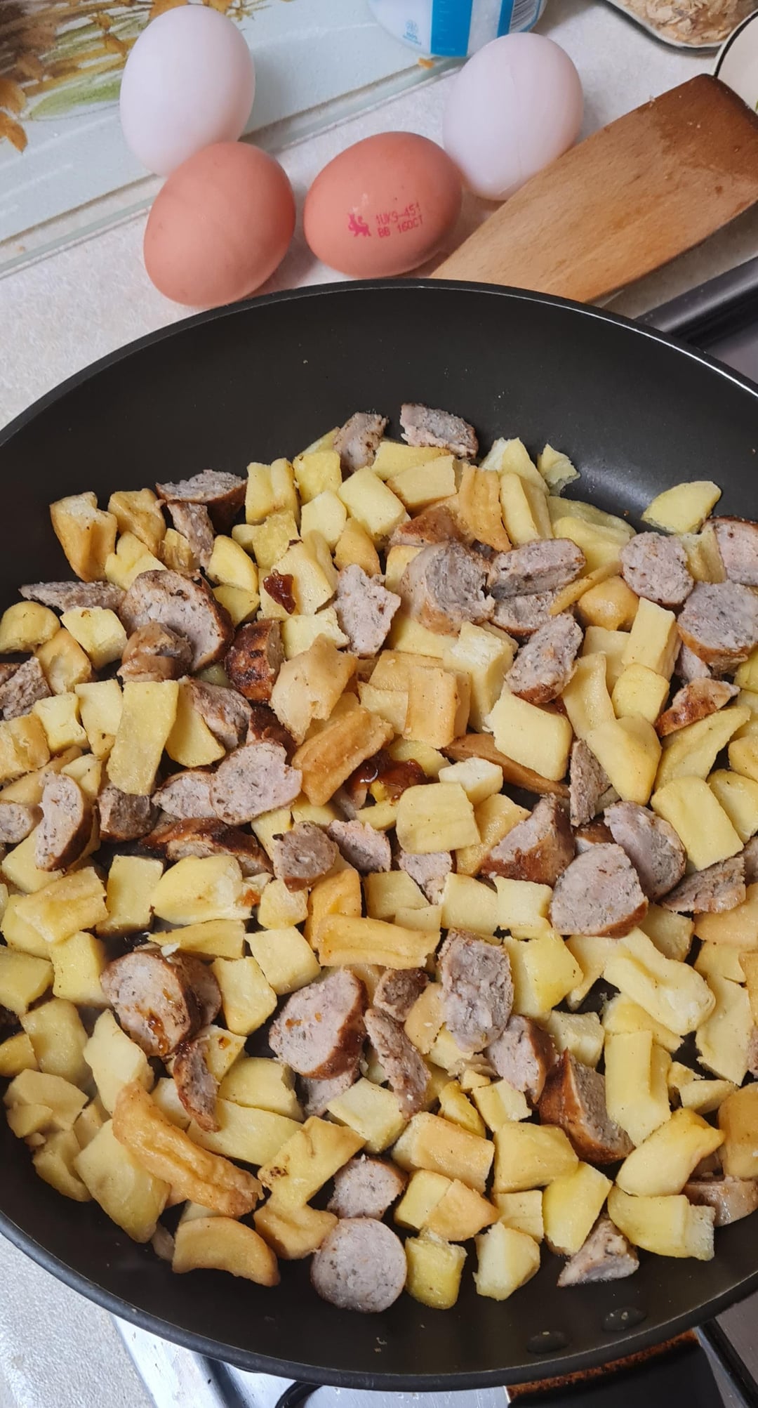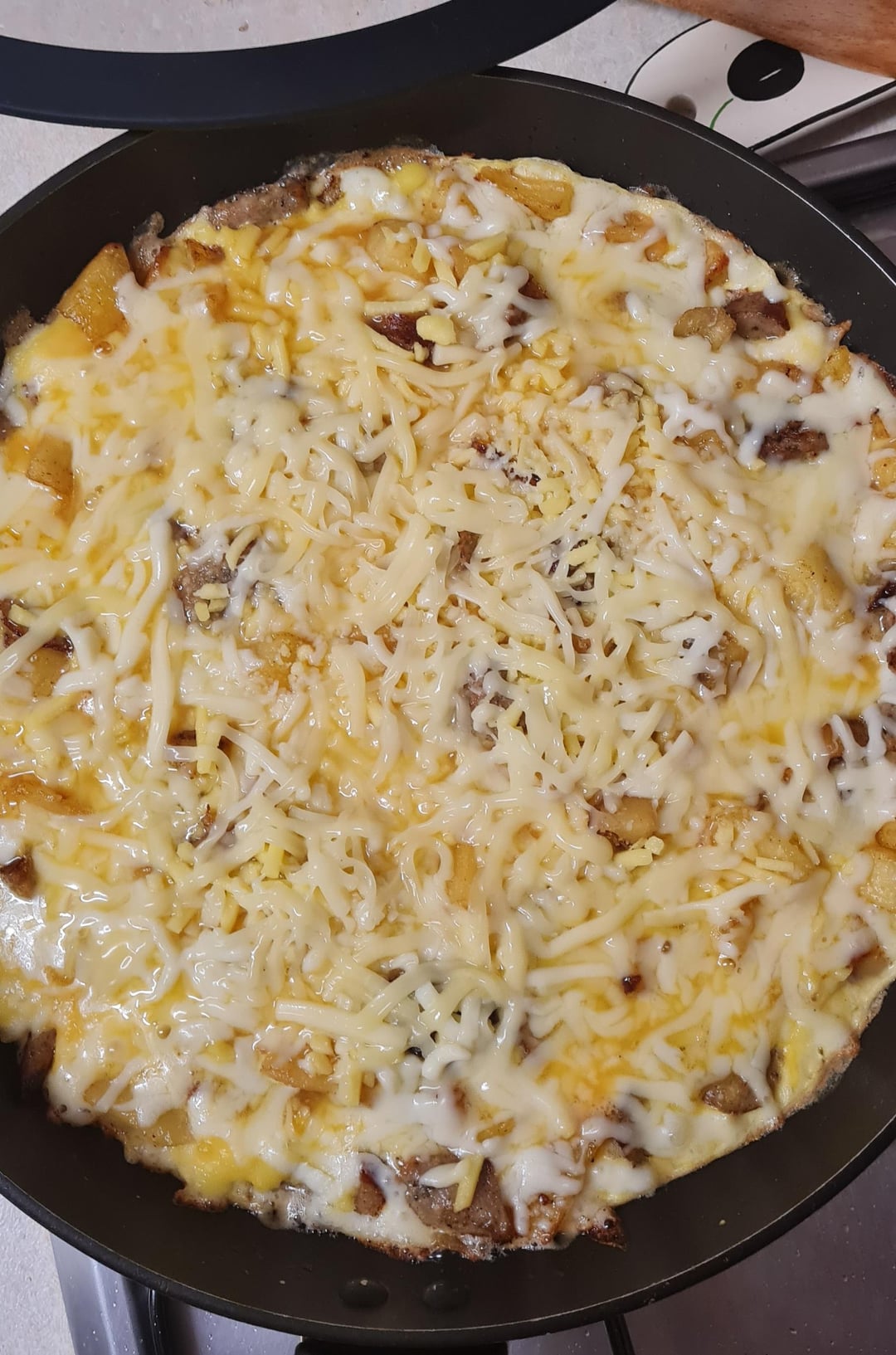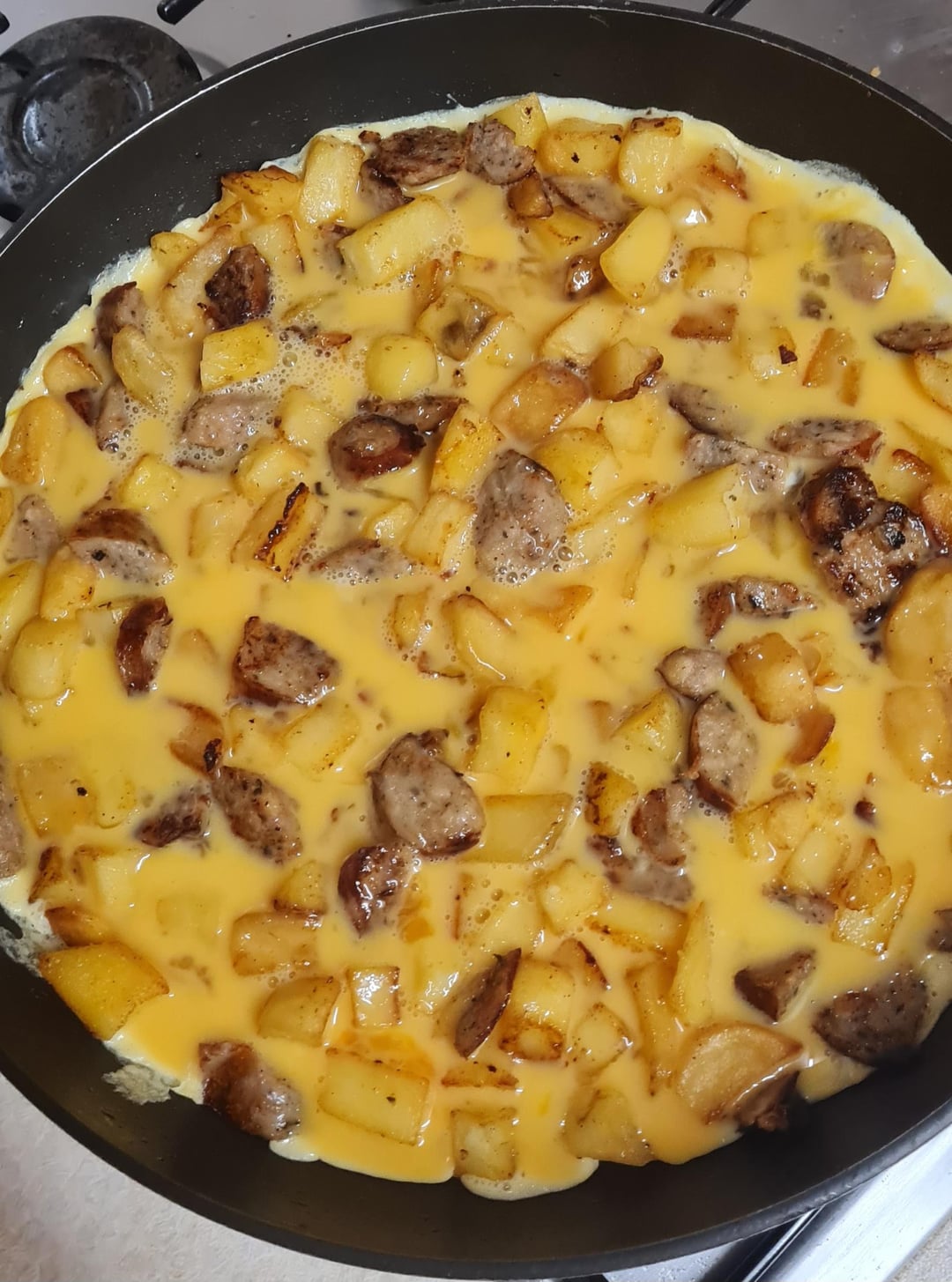 Leftover chips, sausage, 2 duck eggs, 2 chicken eggs, grated mixed cheese.by Bumblebeard63 Write A CommentYou must be logged in to post a comment.