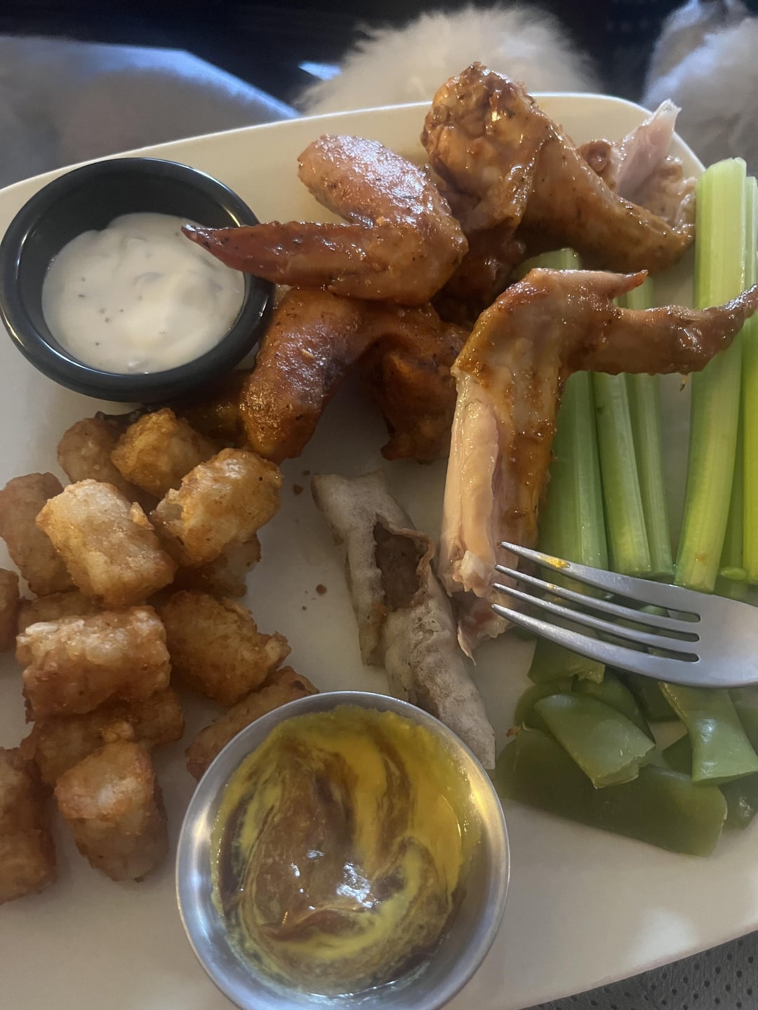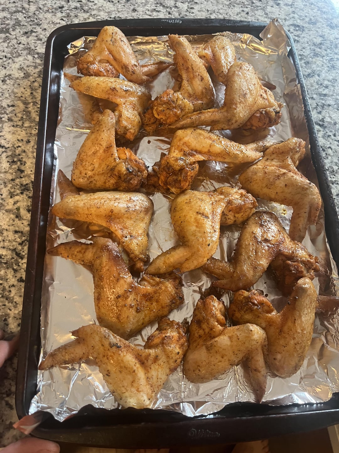 Pickle brine for 12 hours, dried out then bbq seasonings orange pepper and baking powder at 225 for 1.5 hours 10 minutes in the oven to crisp, tossed in garlic Buffalo then 5 more minutes