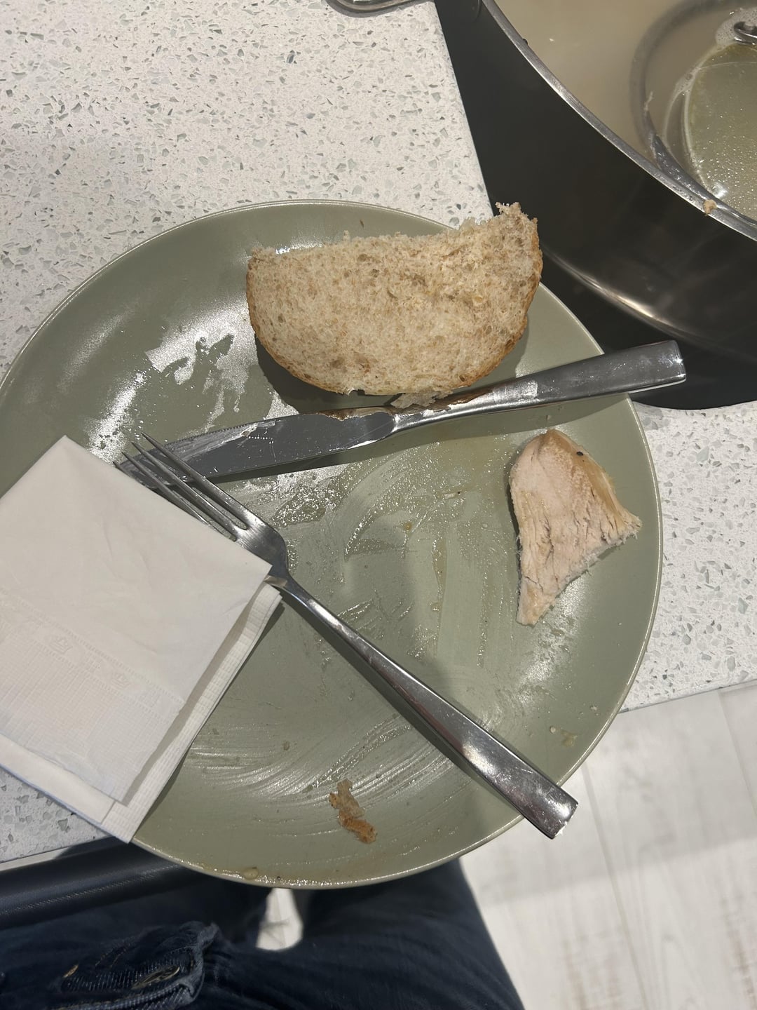 Stuffing, mashed potatoes (butter,cheese,flour,milk), turkey, gravy (made with turkey stalk instead of water), whole wheat kaiser bun, and fruit!