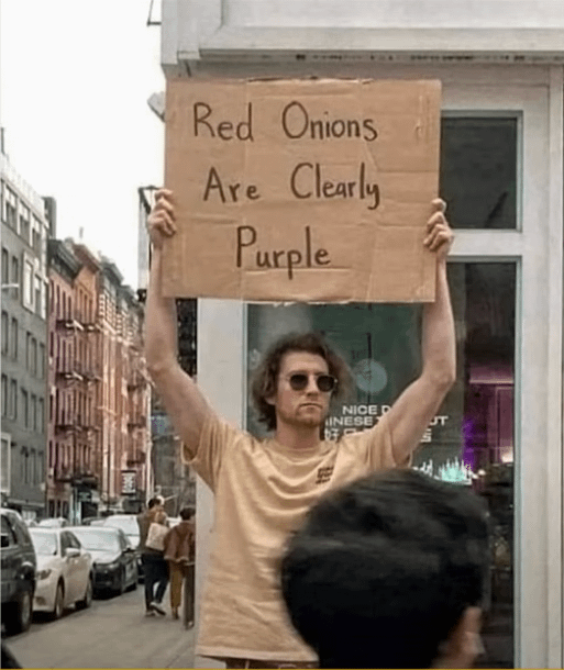 Shots fired by BirthdayBoyStabMan 9 Comments Wonderful_Painter_14 1 year ago But they taste like they’re red honkyponkydonky 1 year ago  NoMorePunch 1 year ago MyFitnessPal lets me call them Purple Onions and for that I am grateful 🥹 Hairy-Wasabi-2996 1 year ago In Spanish Red onions are called Cebolla Morada which translates as purple onion PaulQuin 1 year ago He’s not wrong. GG Septimore 1 year ago Achtuallyy: they are sometimes crimson or purple or even violet.But yes. Never seen RED onion. Now i actually want a red onion, can we breed them somehow? Bombaysbreakfastclub 1 year ago I’m not going to look it up because I’m not a nerd who doesn’t like onionsBut I believe they predate the colour purple and were called red when it meant orange, red, or purple.Could be fake news imgoodatthegame 1 year ago Isnt purple a shade of red tho? Think about it. dynamic_caste 1 year ago Purple originally meant a color that we would call red now, if I recall.Write A CommentYou must be logged in to post a comment.