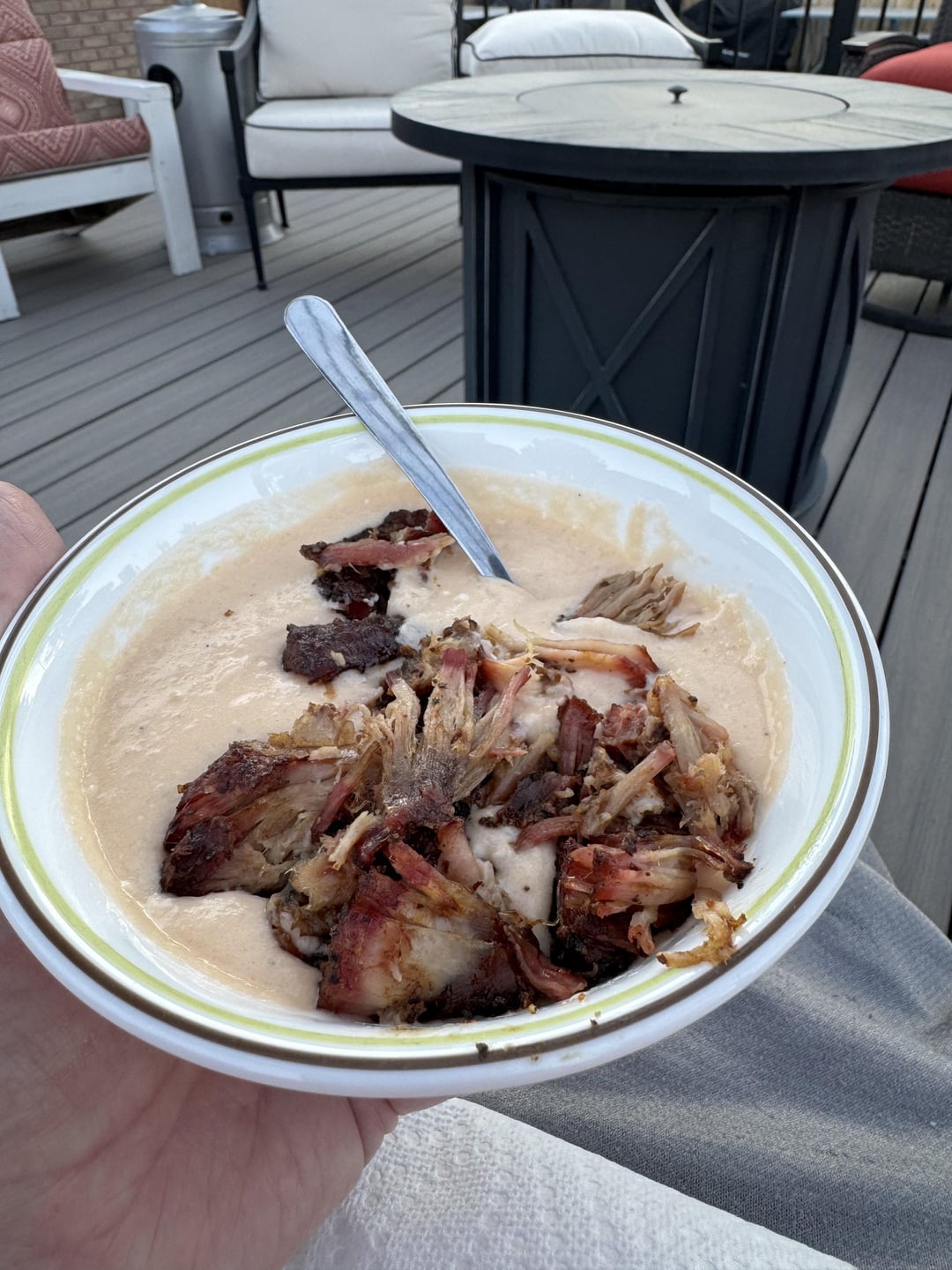 Super Smoke at 200° for 2 – 2.5 hours till the bark is developed then put the meat in a tin pan with 2 cups of chicken or beef stock and a stick of butter then cover tightly with foil. Raise the temp to 300° and braise to finish the cook 2.5-3 hours.