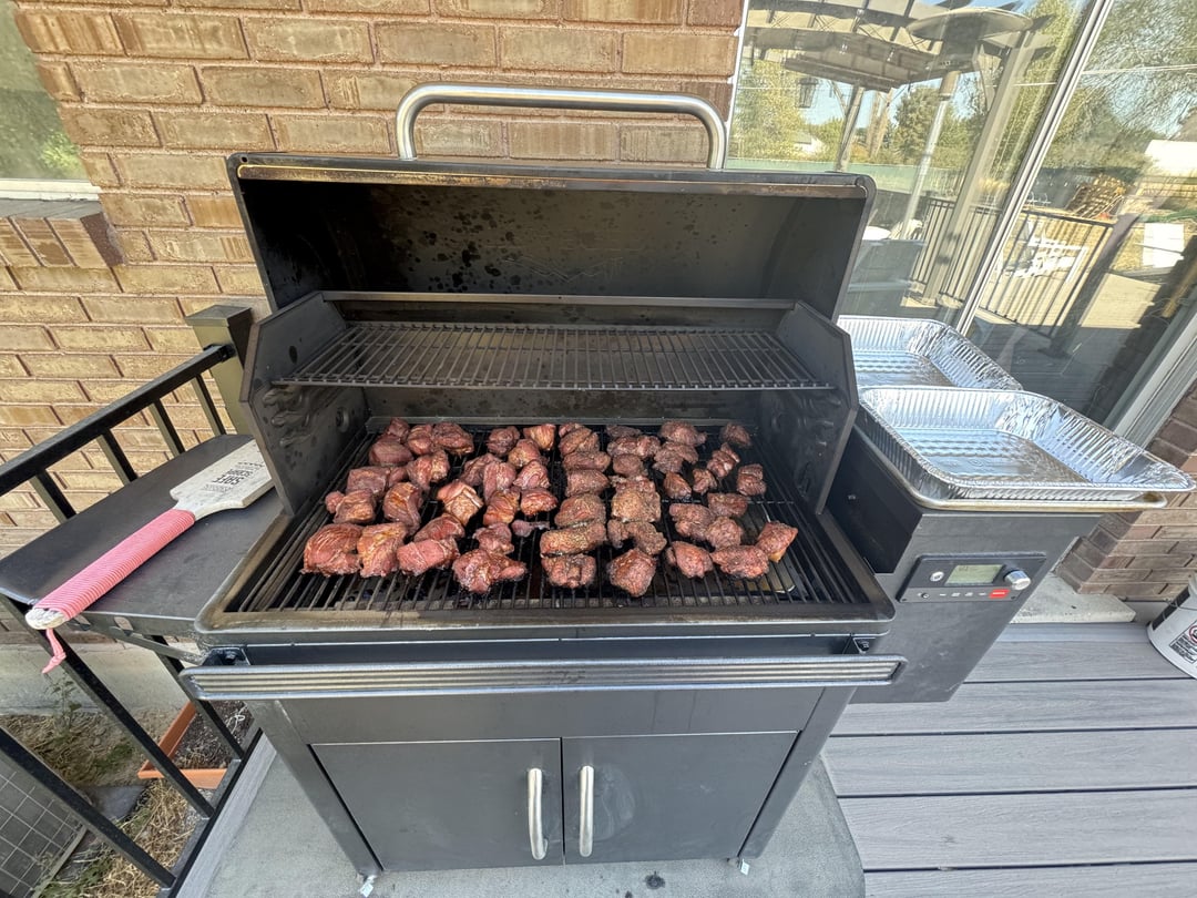 Cube up the boneless pork shoulder and butt and season pretty good. This was half Meat Church Honey Hog and half Salt Lake Garlic.