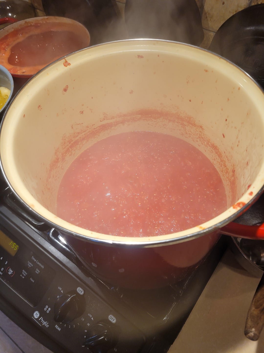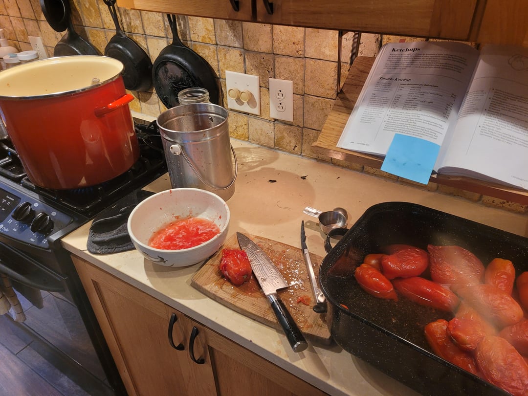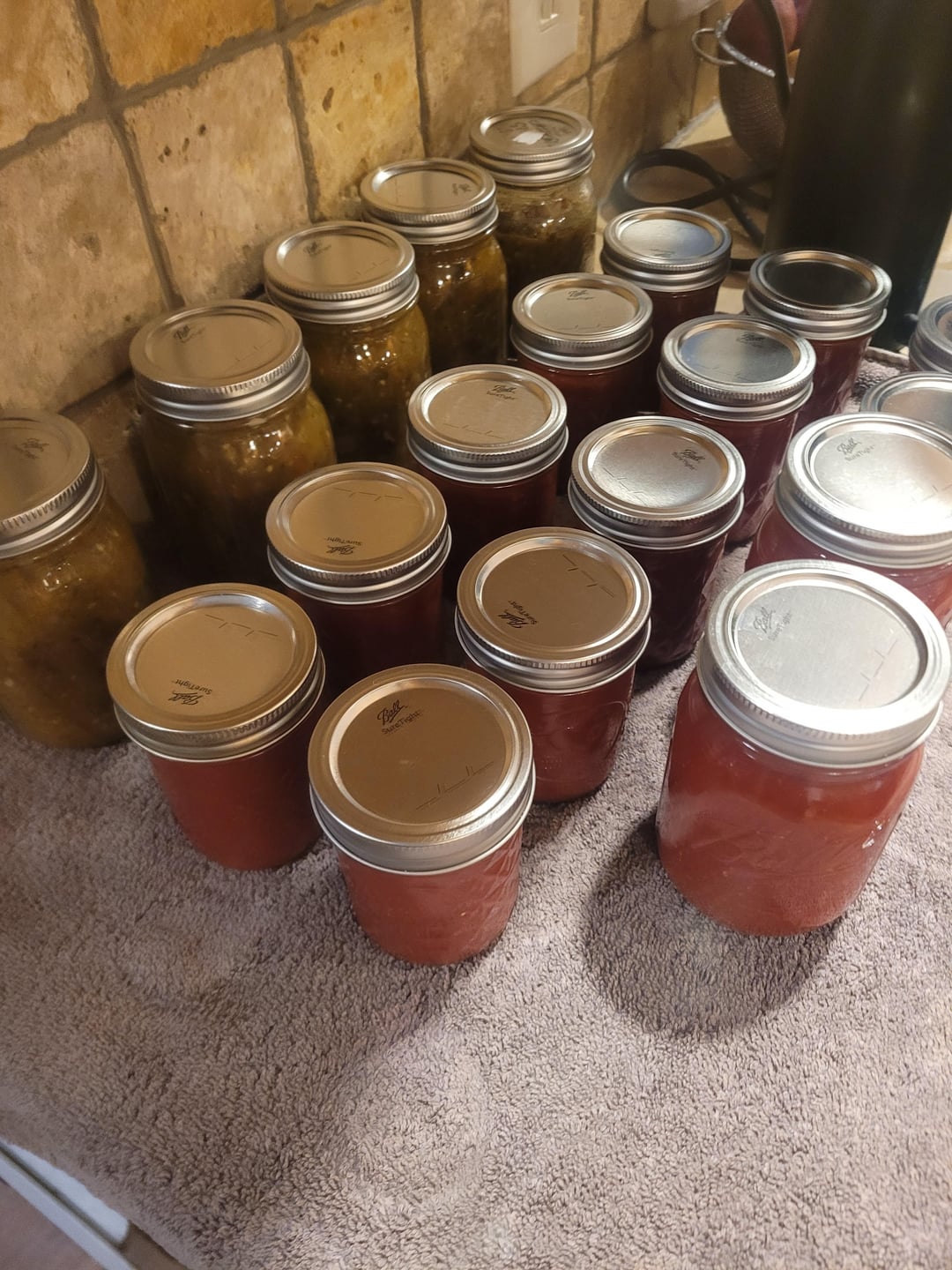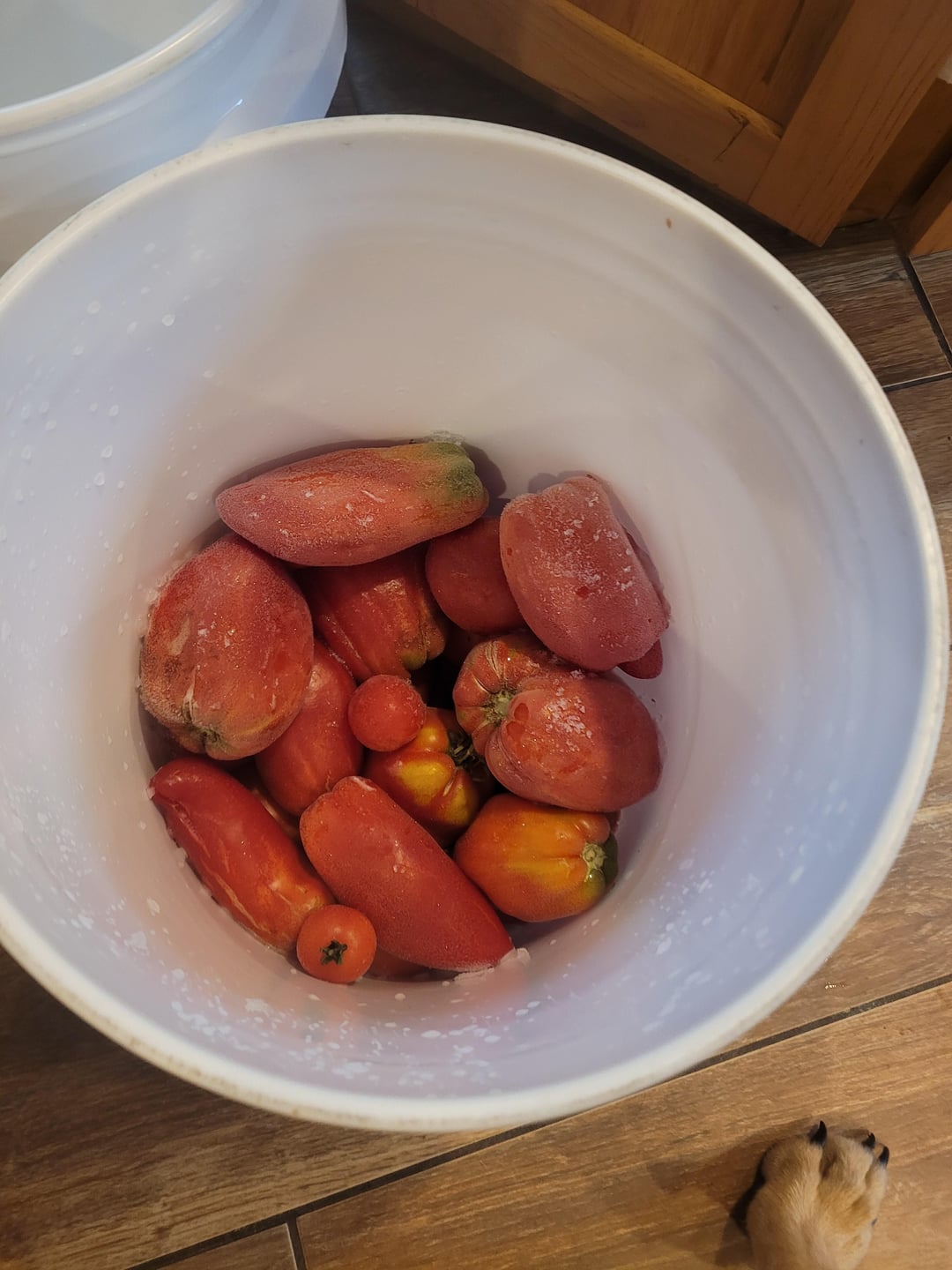 Thanks to everyone for their awesome ideas on what to do with my 10 gallons (nearly 40lbs!) Of tomatoes. They had been frozen so I thawed them in a low oven to remove the skins and water and made Sombrero BBQ and Ketchup from the Ball book. I made salsa verde from the green tomatoes. Luckily there was an extra jar that didn't fit in my canner from each batch for eating immediately 🙂