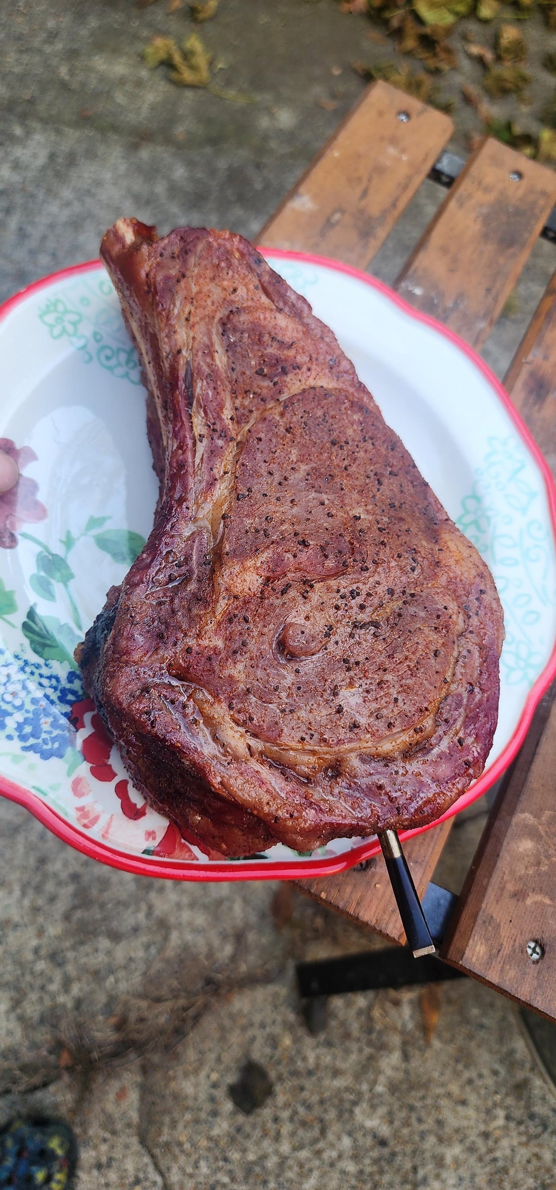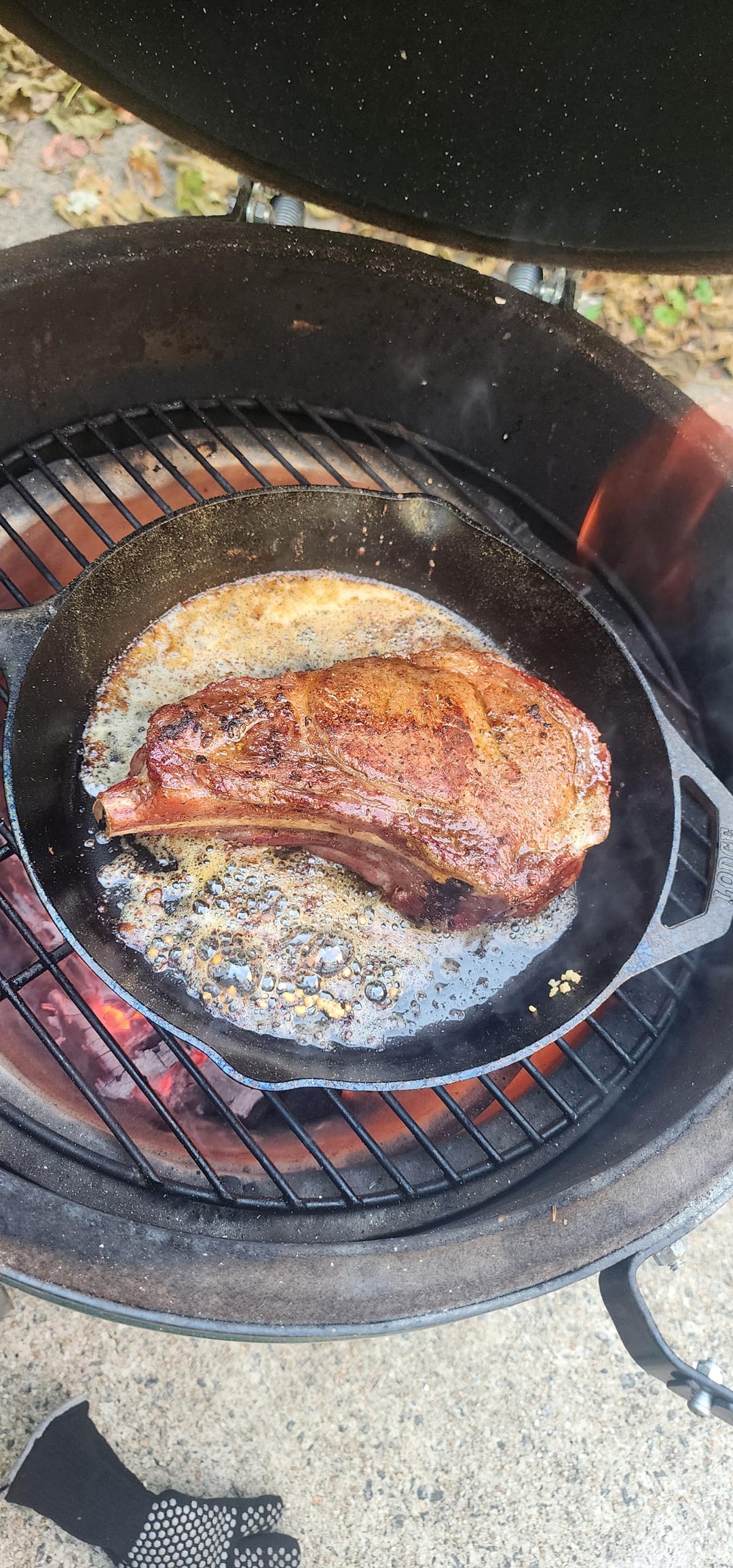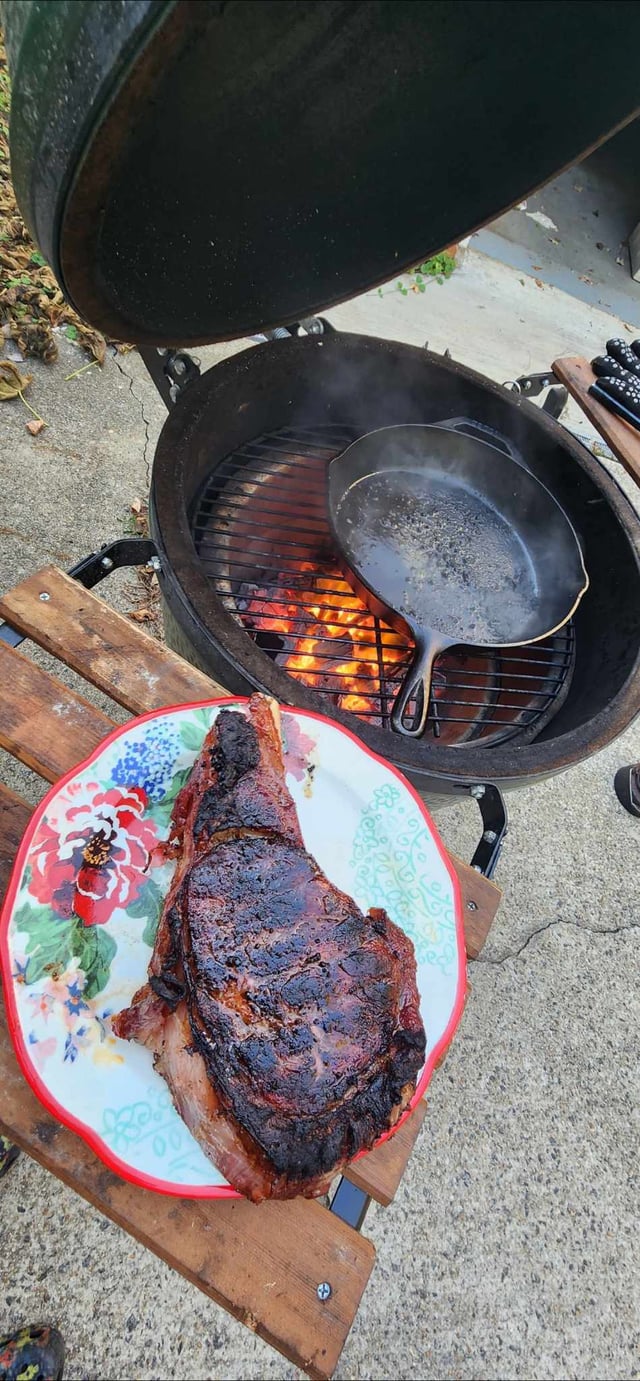 Removed conveggtor and wide open until over 600f with the Cast Iron in the egg to heat up. Half stick butter, garlic cloves, thyme in the cast iron and seared on their for 2 minutes each side, flipping every 60 seconds.
