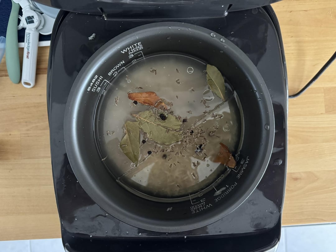 5. While smoking, cook 2.5 cups of basmati rice with 1 stick of cinnamon, 1 tablespoon of cumin seeds, 1 tablespoon of peppercorns, 2 tablespoons of oil and 1 teaspoon of salt, i use a rice cooker because the texture of the rice is perfect for biryani (Picture 8)
