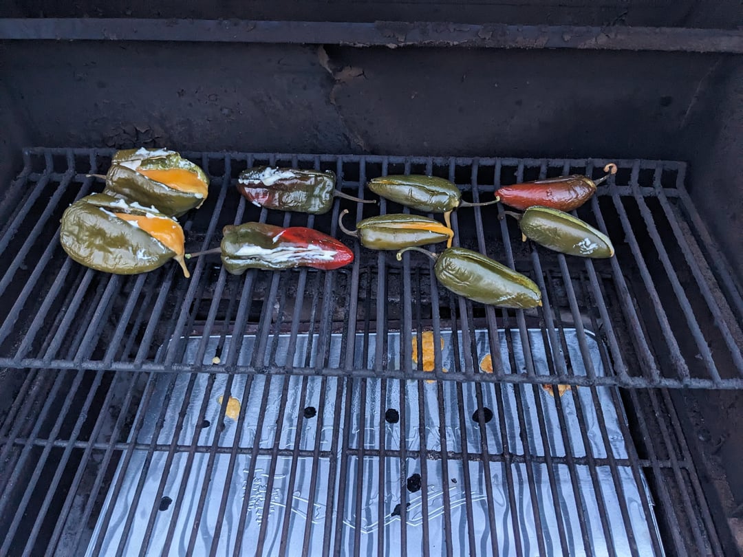 The pepper saga continues. Smoked poblanos and jalapeños, stuffed with cream cheese, cheddar, and Monterey jack.