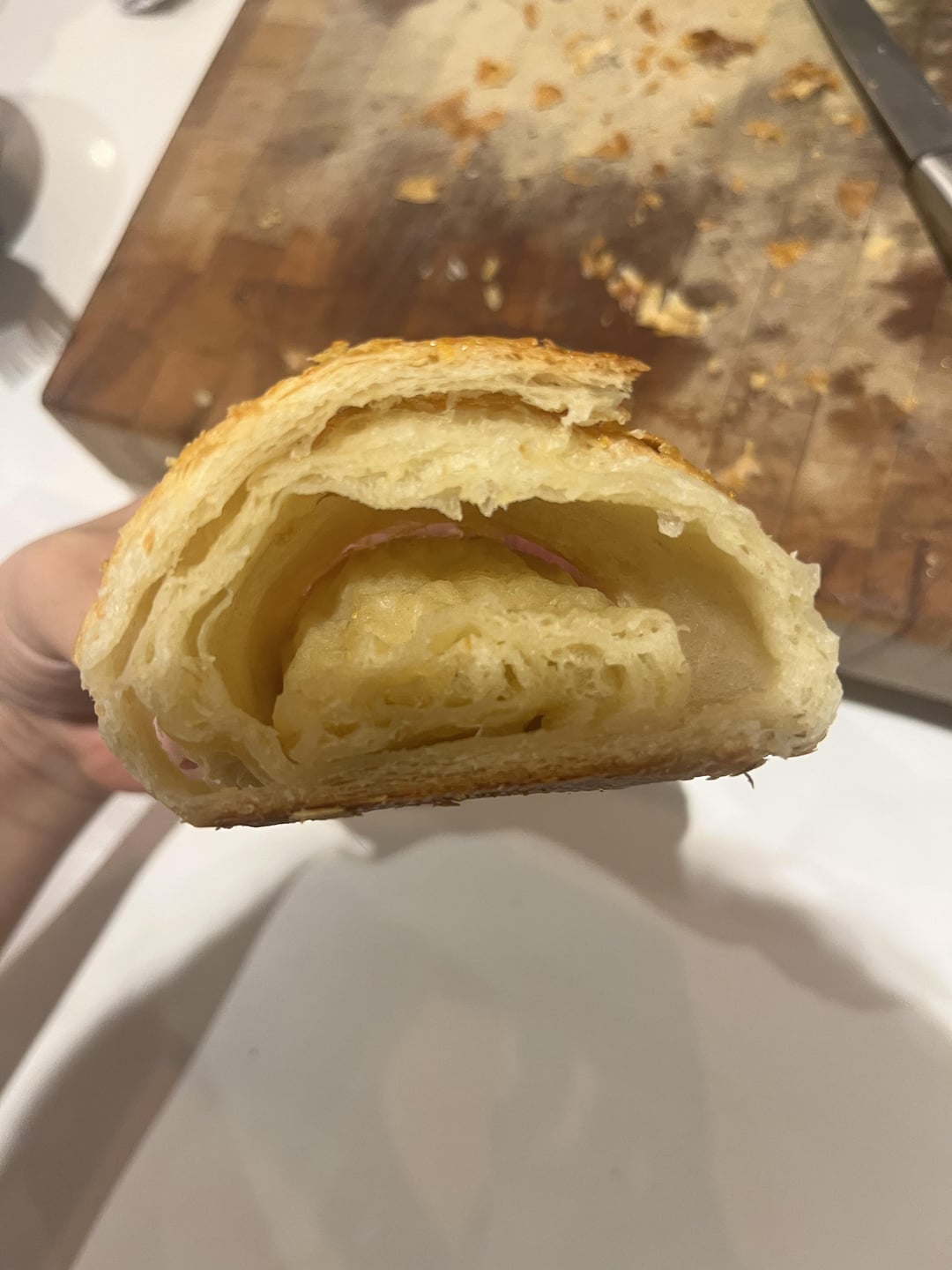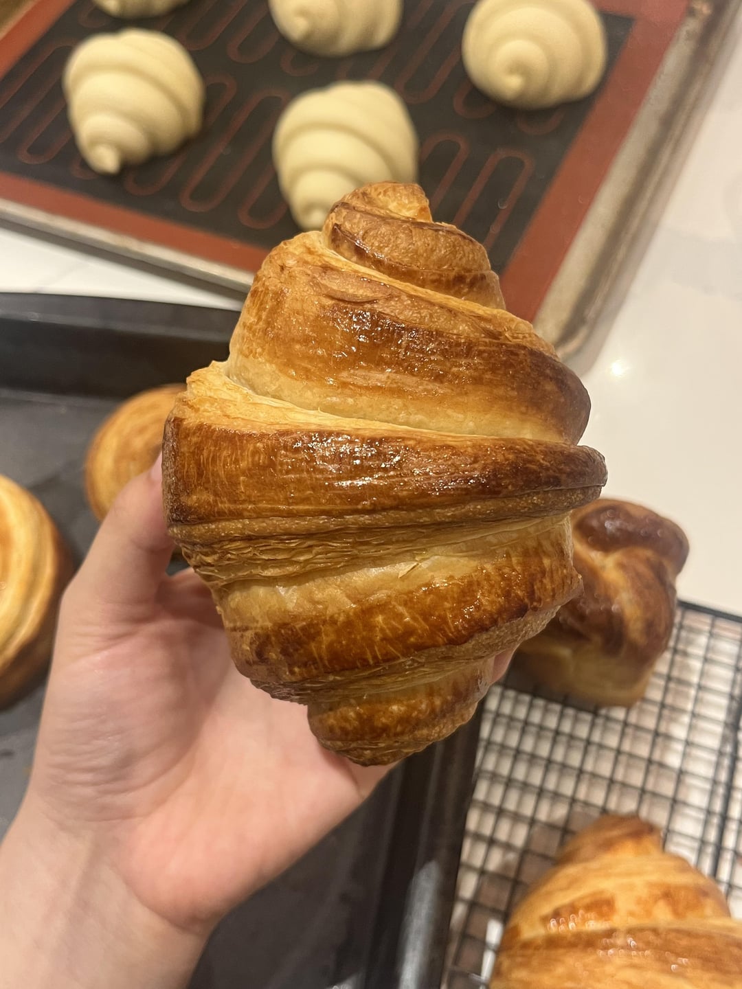 As you can see, I was baited by the exterior of these croissants as they came out of my oven, the beautiful flakes promising a bright close future as I cut into them. Unfortunately, I am a lazy bitch and I happen to have midterms soon, and after waiting 3 hours to let these hoes proof I no longer gave af about the 3 days I had spent preparing these. Mind you, this is my first time making croissants and I did a shit ton of research and so I learned you had to maintain humidity/DDT, which a lot of people did by putting a whole thing of hot water on the bottom rack of the oven. Does butter not melt in this universe anymore?? Yall wild but I digress. I wasn’t gonna take my chances so I stuck some hot water in there occasionally to get some steam while using a thermometer to maintain 26C within my oven. TELL ME WHY THEY ONLY ROSE FUCKING LIKE 50% AFTER 3 HOURS and barely did that wobbling thing. Anyways i baked that ish and it came out crisp and fragrant and delectable, until I cut into it and it turned out to be FLAT and WET and DEFLATED. Anyways yall better than me idk how some of u do this all the time butters expensive