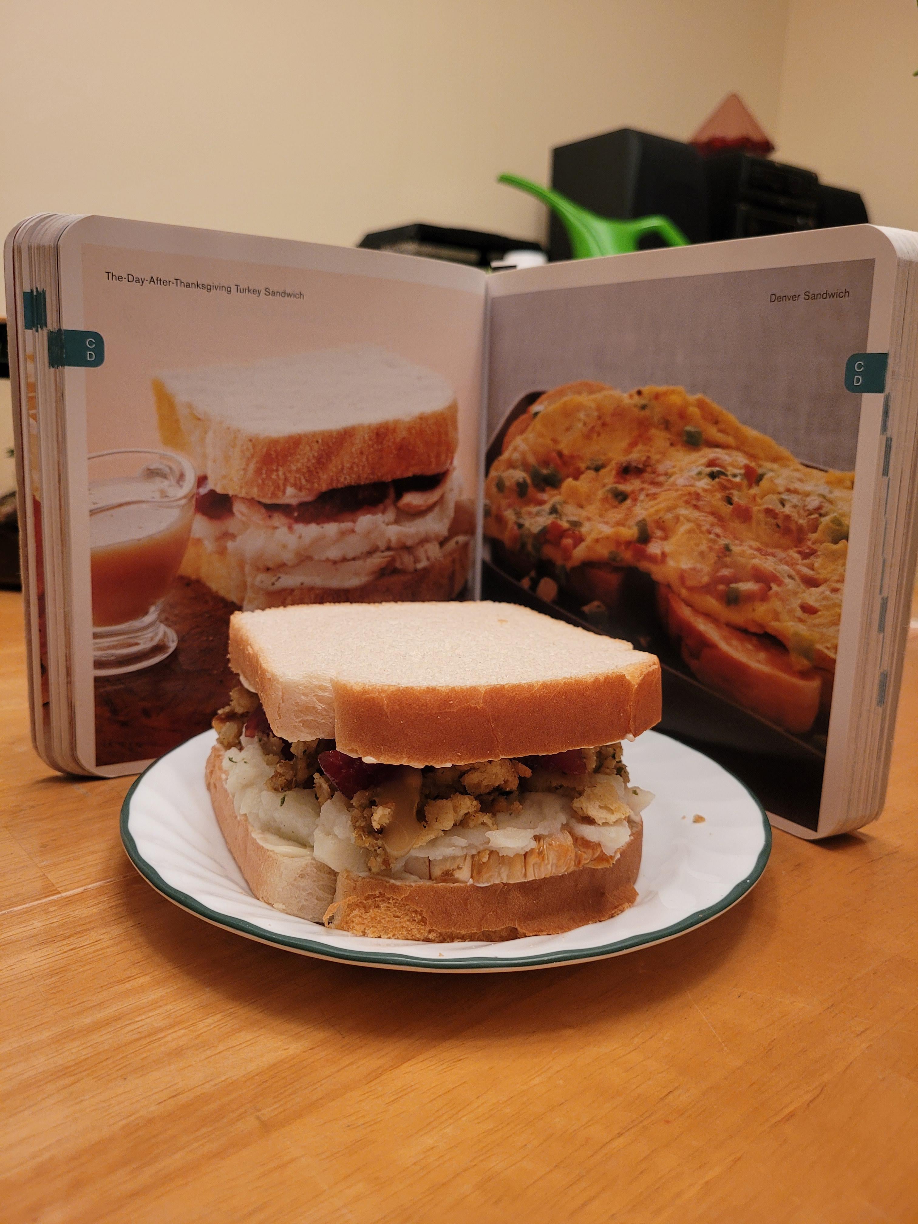 Continuing my mission to make as many sandwiches from The Encyclopedia of Sandwiches (by Susan Russo) as I can, #18 is the-day-after-Thanksgiving turkey sandwich. Super messy! But good! It had turkey, mashed potatoes, stuffing, cranberry jelly, gravy and mayonnaise. Every bite was like a different flavour. Maybe Thanksgiving meal should just be sandwiches like this.