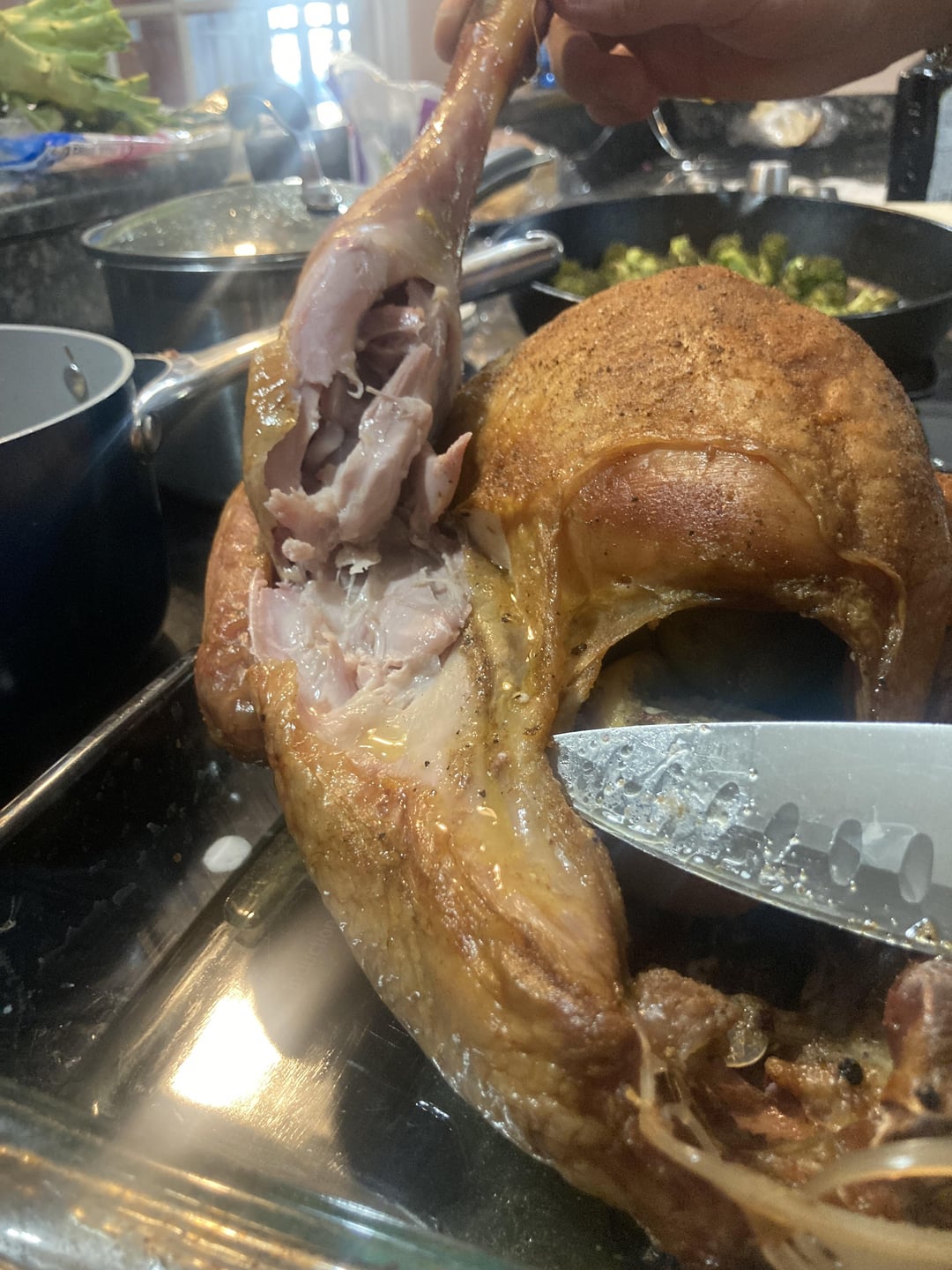 Turkey – 12 pounds, brined over night, buttered under the skin, hickory smoked 9 hours at 225 degrees in a Traeger, probe was at 175 the last 2 hours. Came out juicy and flavorful. Next time I’ll probably smoke it in a shallow metal pan to keep the juices, rather than letting them drip.