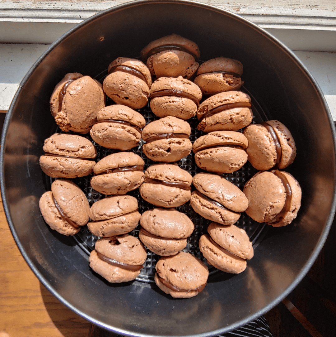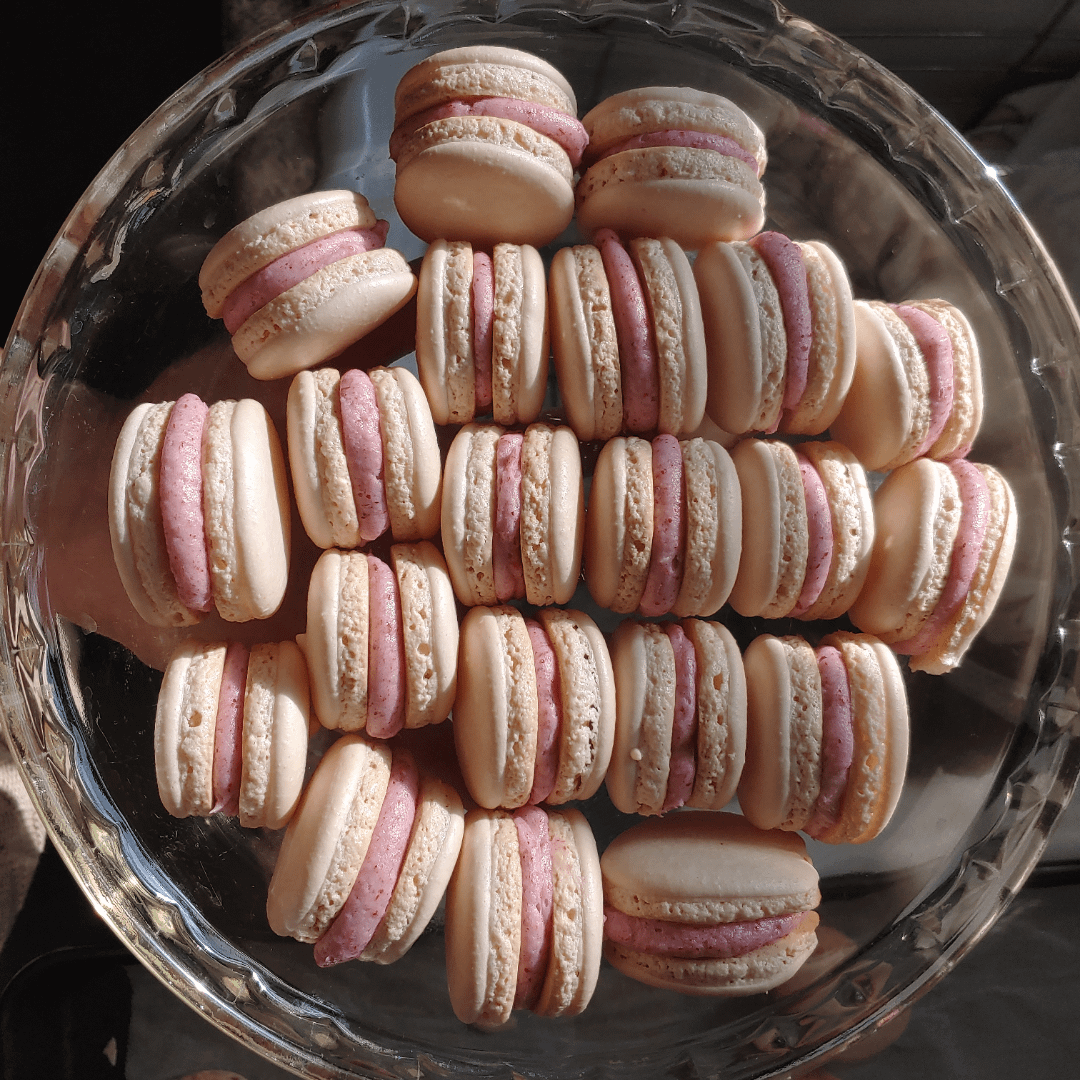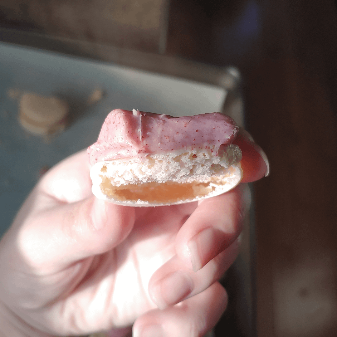 The next batch was plain shells with pink food coloring and a raspberry lemon cream cheese frosting. I used the recipe by Preppy Kitchen as featured on Binging with Babish's macarons episode. For the filling, I found some leftover cream cheese frosting in my freezer (equal volume cream cheese and butter, plus powdered sugar to taste). I let this thaw, then added about 2 tsp lemon extract and freeze dried raspberries which I crushed and sifted in to remove seeds. I didn't measure things precisely with the frosting, just tasted and adjusted. The final result was so good I couldn't stop eating it! I used the leftovers to make raspberry cheesecake overnight oats for tomorrow's breakfast.