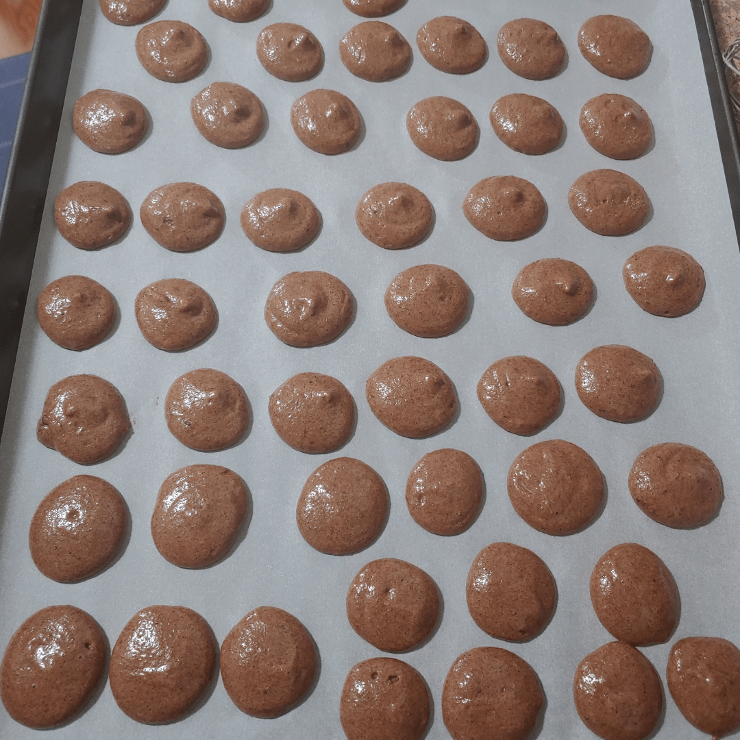 The first batch was chocolate shells with chocolate ganache using the recipe by King Arthur Baking. You'll notice lots of cracking, because a lot of the macarons did not form a shell before baking. I left them to dry out for quite a while, but it was about 84°F in our house that evening. I got impatient after about 1.5 hours and baked them prematurely. While the chocolate ganache was delicious as always (I used Thescranline.com 's chocolate ganache ratios), I didn't love the brownie flavor of the shells and the texture wasn't quite right, I think because I didn't process/soft thoroughly enough. They also had a powdered sugar aftertaste to them.